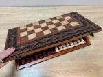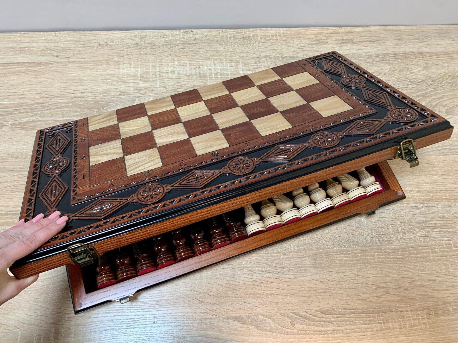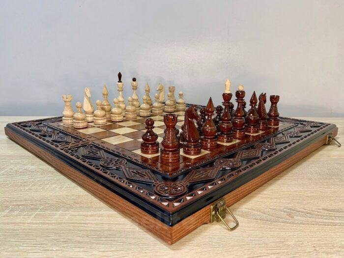 This chess set combines the beauty of classics and convenience in every detail. The folding board is made of ash and decorated with neat carvings with clear markings of the playing field. Inside, there is a soft velvet compartment with cells for careful storage of figures – a practical solution for home and travel.