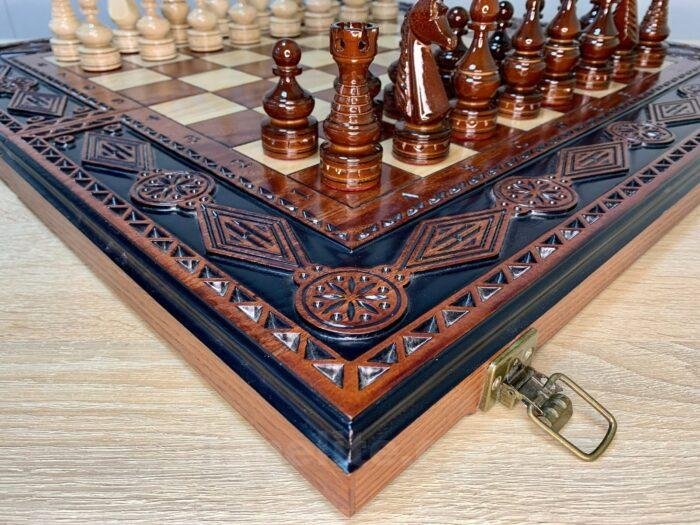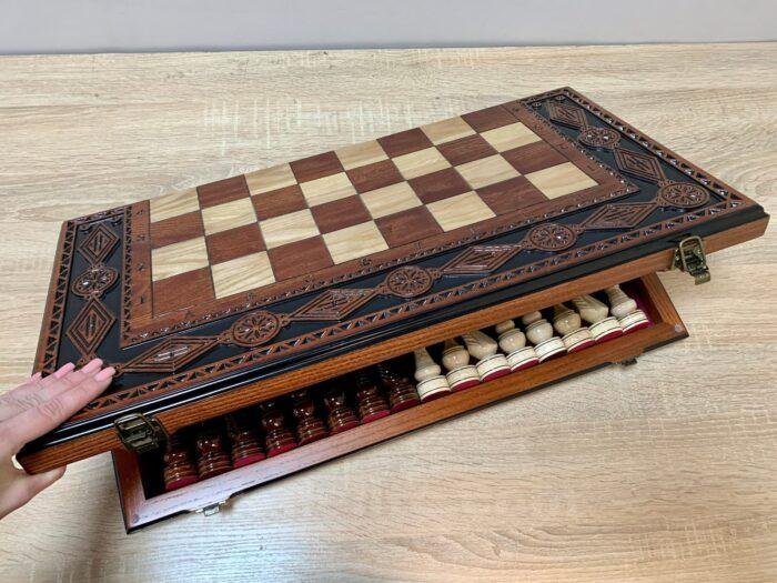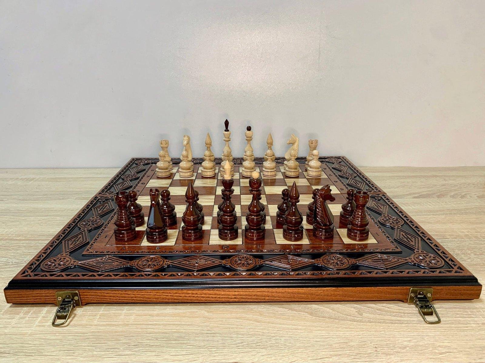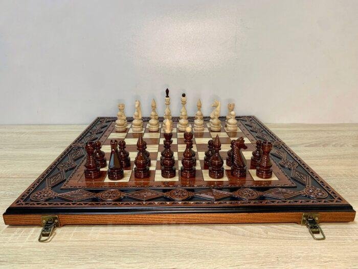 DESIGN: folding board with velour storage, decorated with carvings; the chess pieces are made in classic design; exclusively designed by our “Elen Elite” craftsmen.