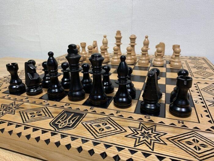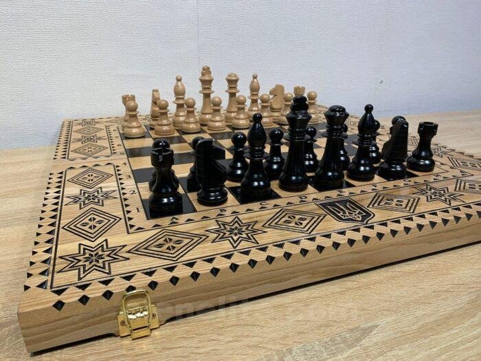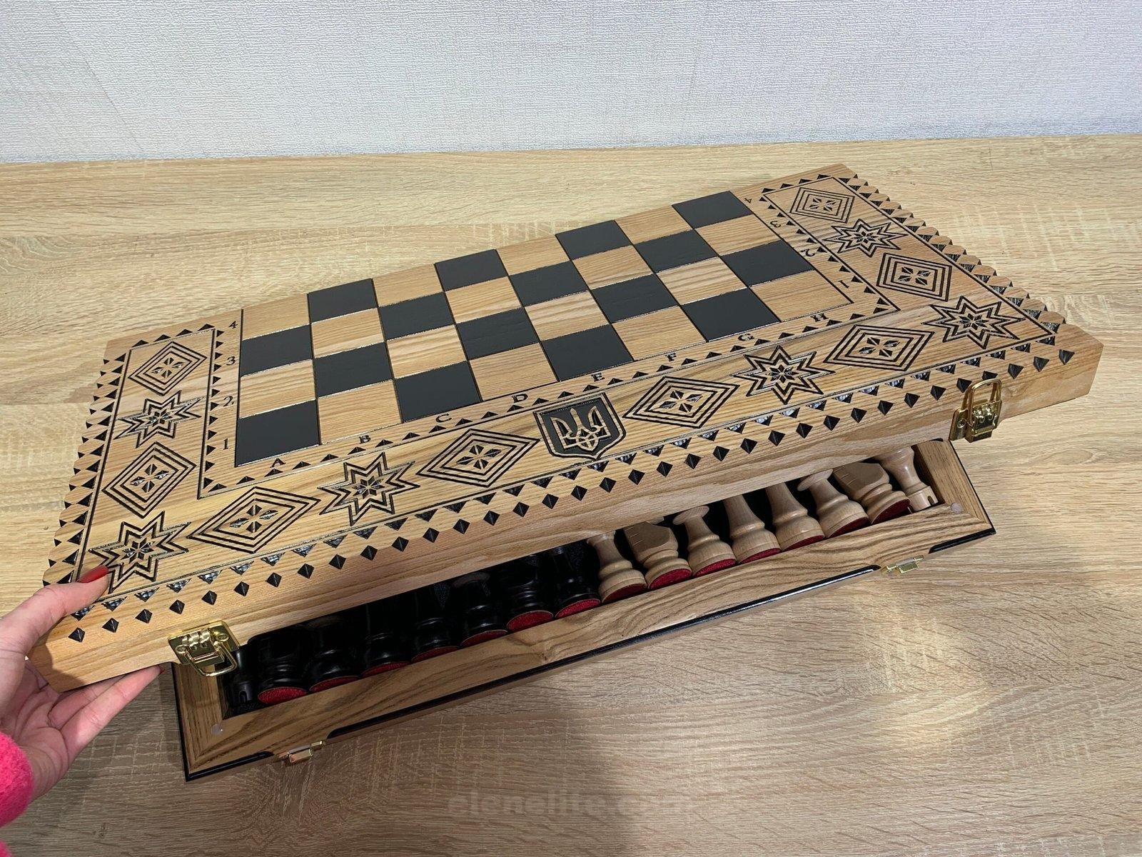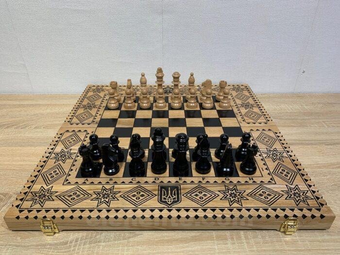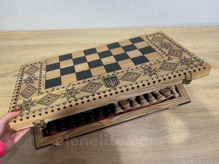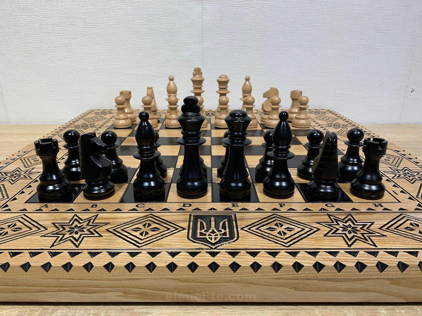DESIGN: folding board with velour storage, carved patterns of eight-pointed stars and Ukrainian Trident; the chess pieces are made in a classic design; exclusively designed by our “Elen Elite” craftsmen.