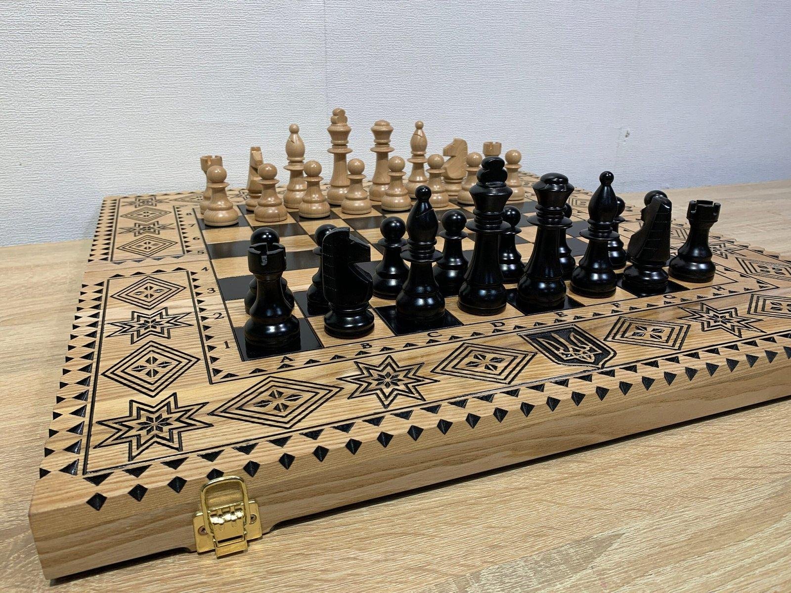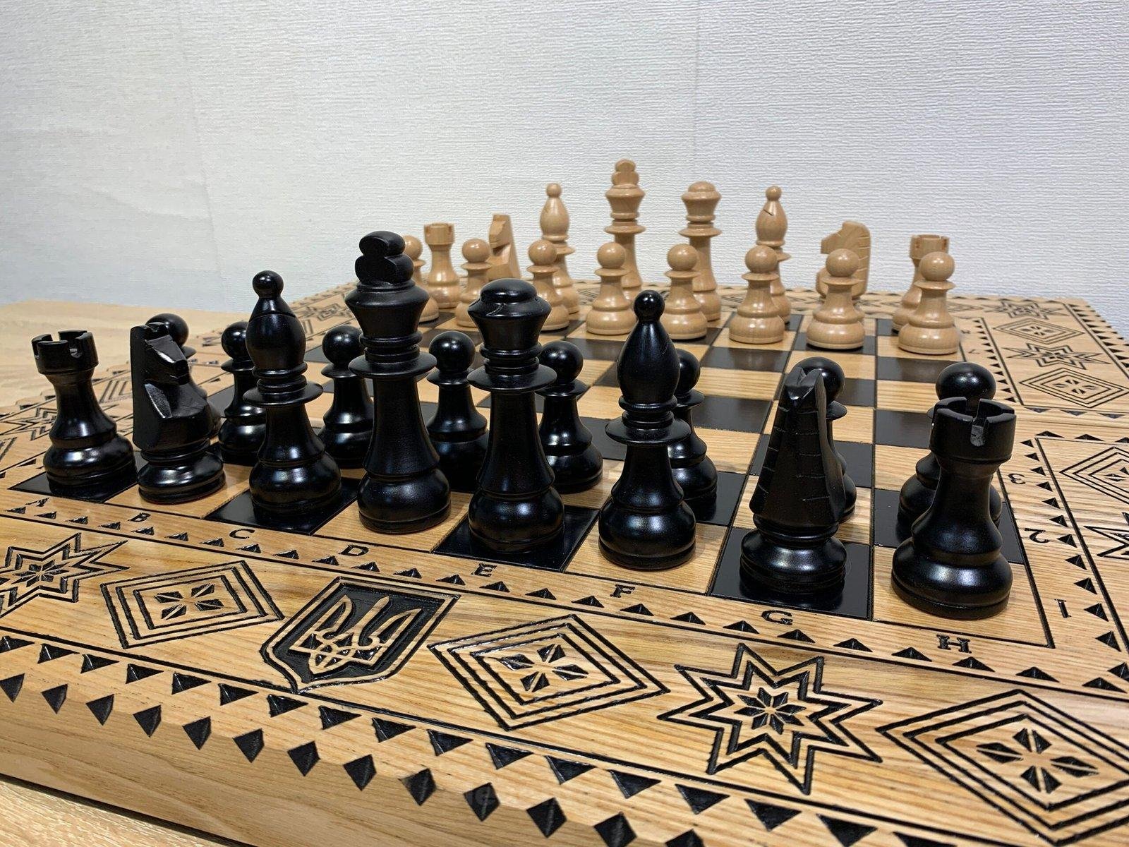 This chess set is designed for comfortable play and easy storage. The folding ash board in natural beige with accent black carving is decorated with eight-pointed stars and the Coat of Arms of Ukraine. Clear markings and expressive wood texture make games as enjoyable as possible. Inside the board there is a soft velvet backing that securely fixes and protects the pieces during storage and transportation. Maple pieces in a classic style, painted in harmonious black and beige tones. This set is equally convenient for home use and for travel, combining practicality and aesthetics.
