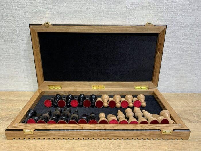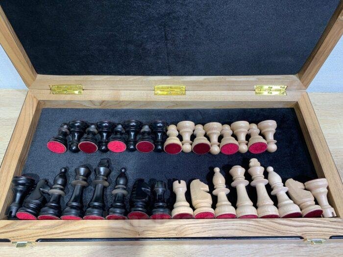 Convenient and stylish chess set: folding ash board with velvet backing in a unique design and classic maple pieces in the set. Beautiful, compact and comfortable to play and store.