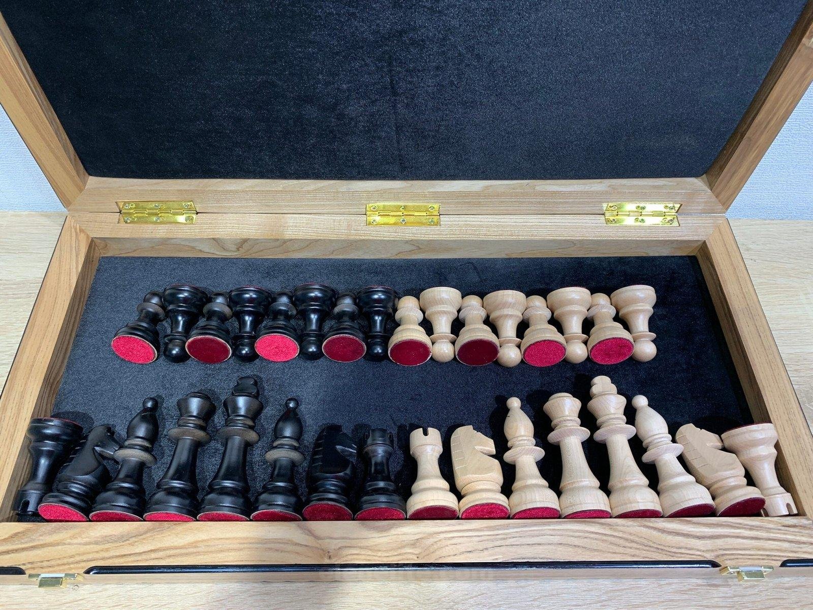 MATERIAL: chess board – solid ash wood; chess pieces – maple wood; each chess piece has a velvet backing for easy sliding on the board and protection from scratches