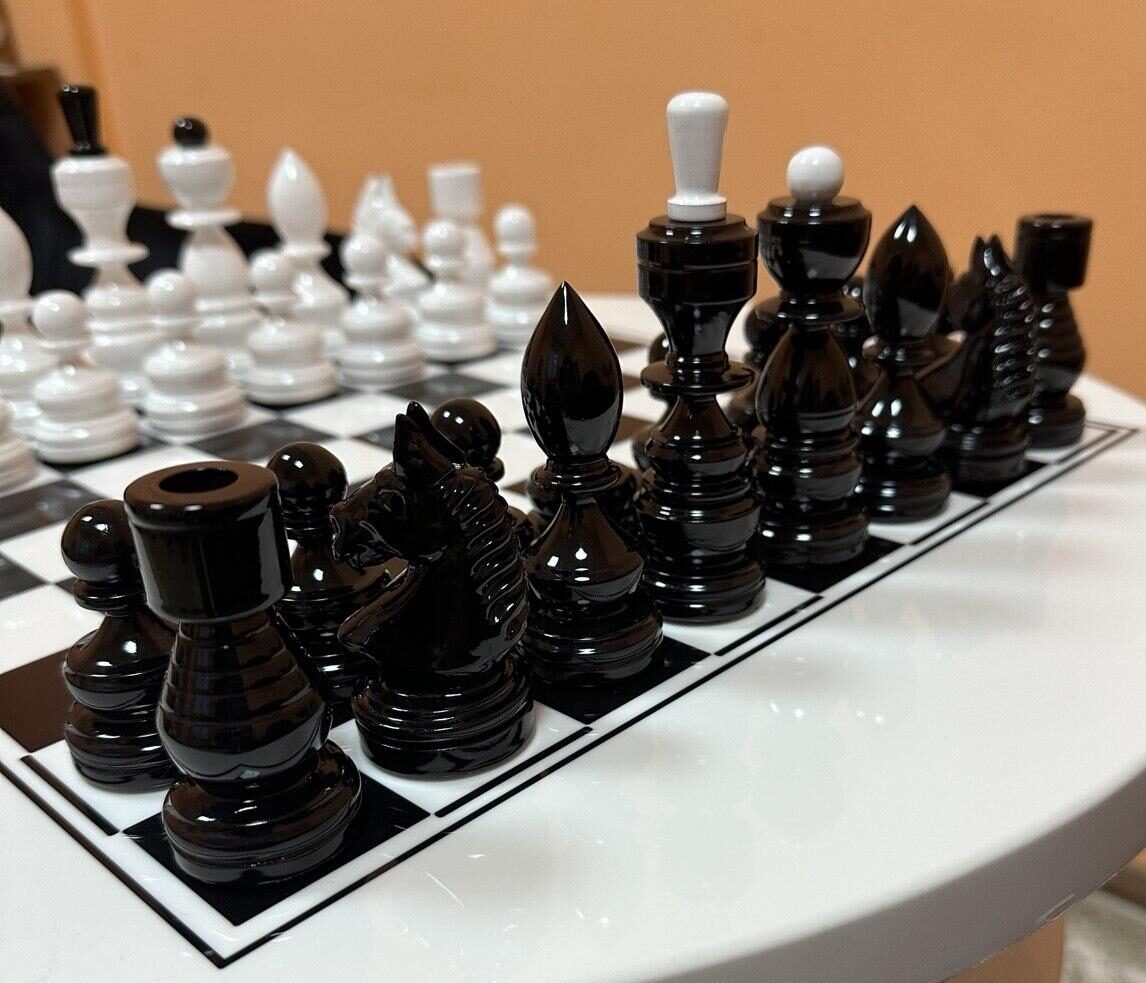 Elegant chess pieces in a classic design, handcrafted from premium maple. The black and white color scheme and striking high-gloss finish highlight the clean lines and impeccable craftsmanship. An ideal choice for connoisseurs of classic style and premium craftsmanship.