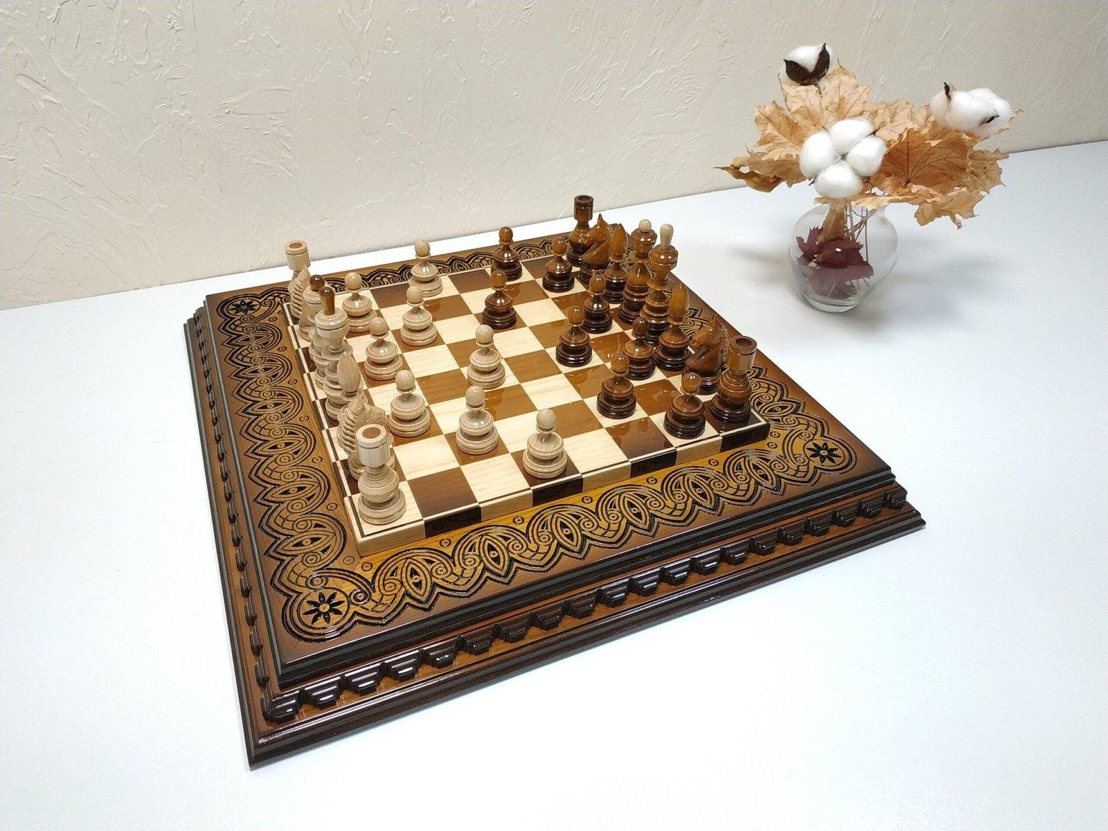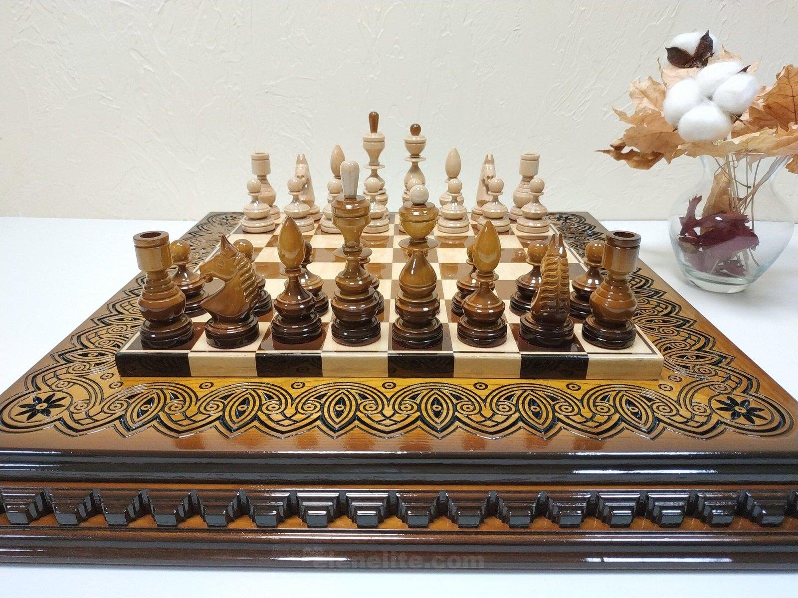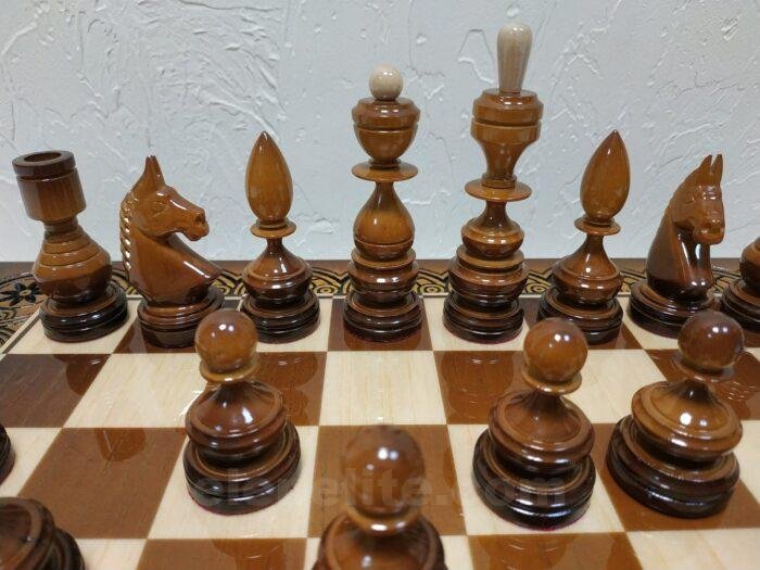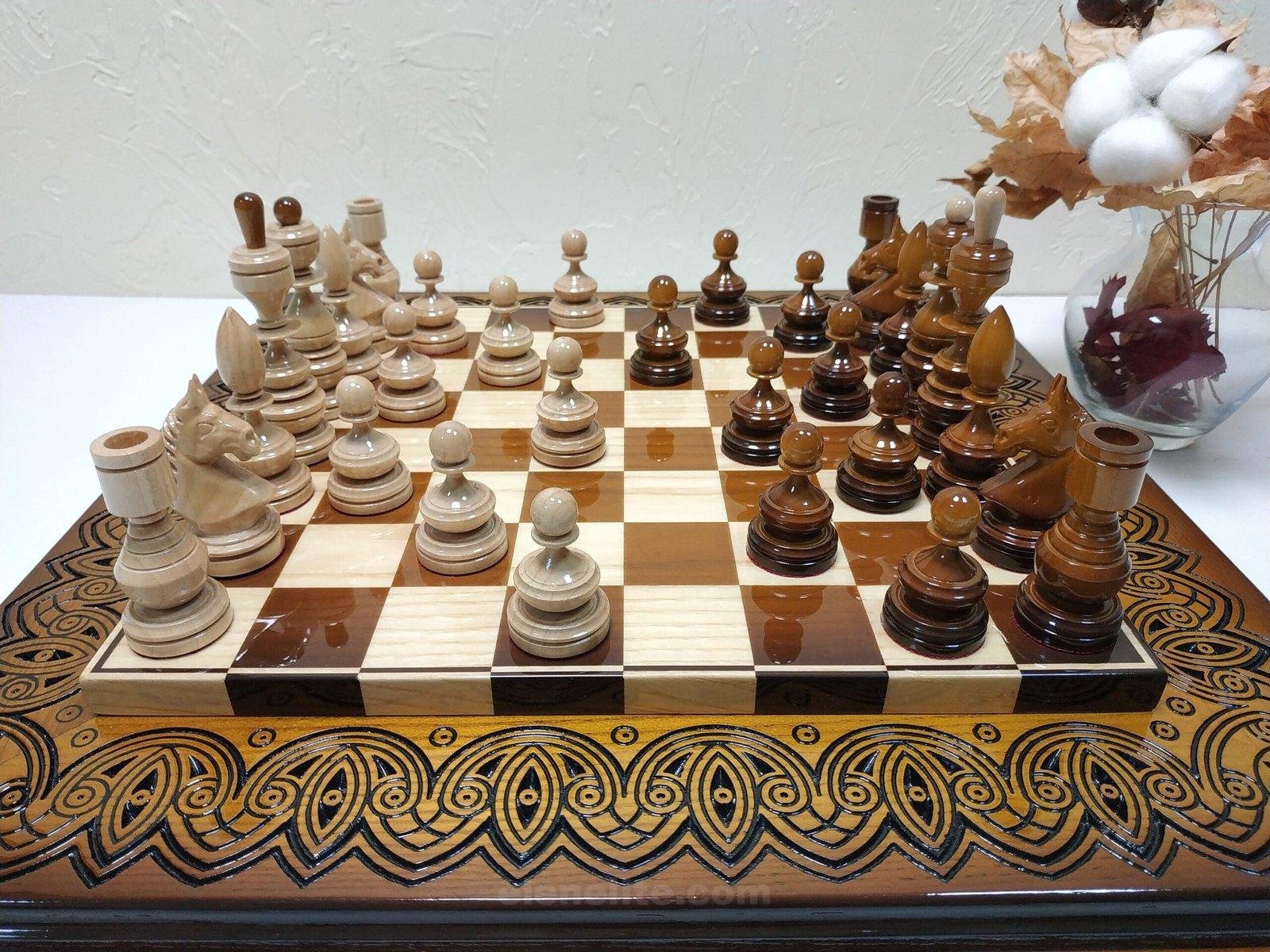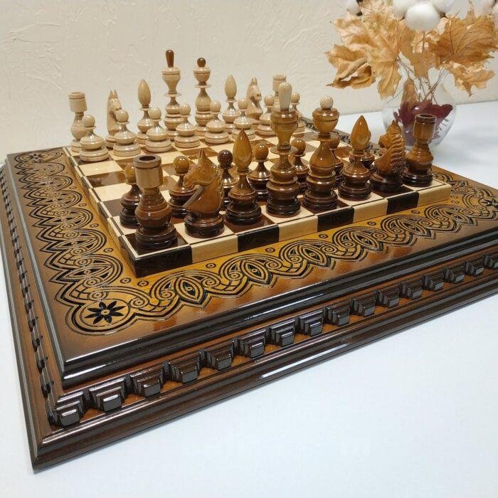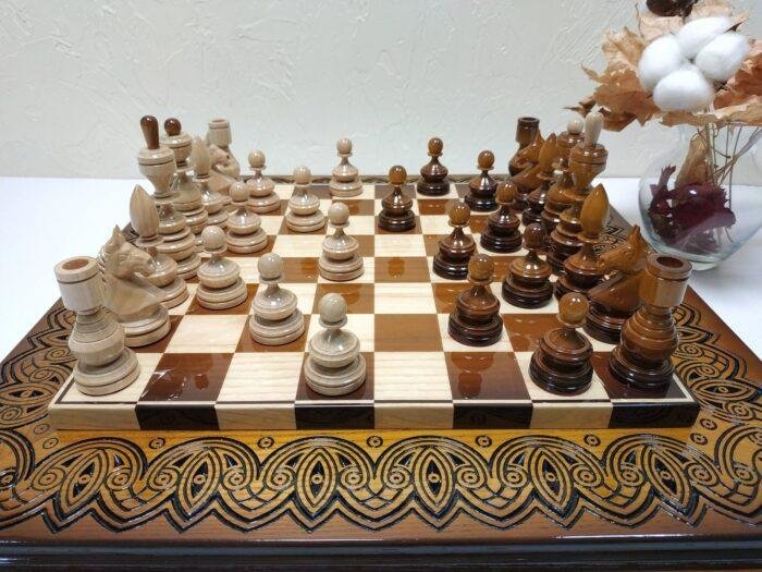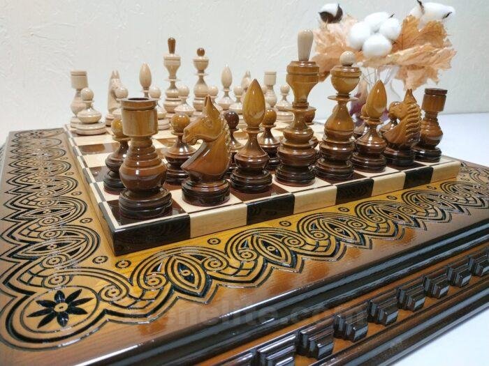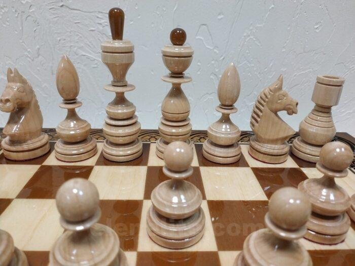 The pieces are handcarved from maple, maintained in a classic design and painted in the same color as the board. The glossy finish makes them not only aesthetically expressive, but also pleasant to use.