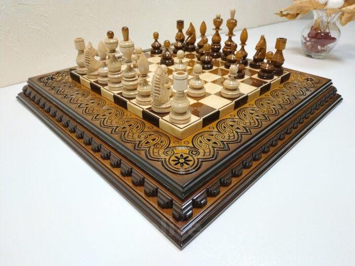 A premium chess set that combines an exquisite appearance and high-quality handcrafted workmanship. The chess board is made of ash, decorated in a brown palette with an ombre effect, creating a smooth transition of shades. The surface is covered with a super-gloss varnish, giving a mirror shine and protecting against scratches.