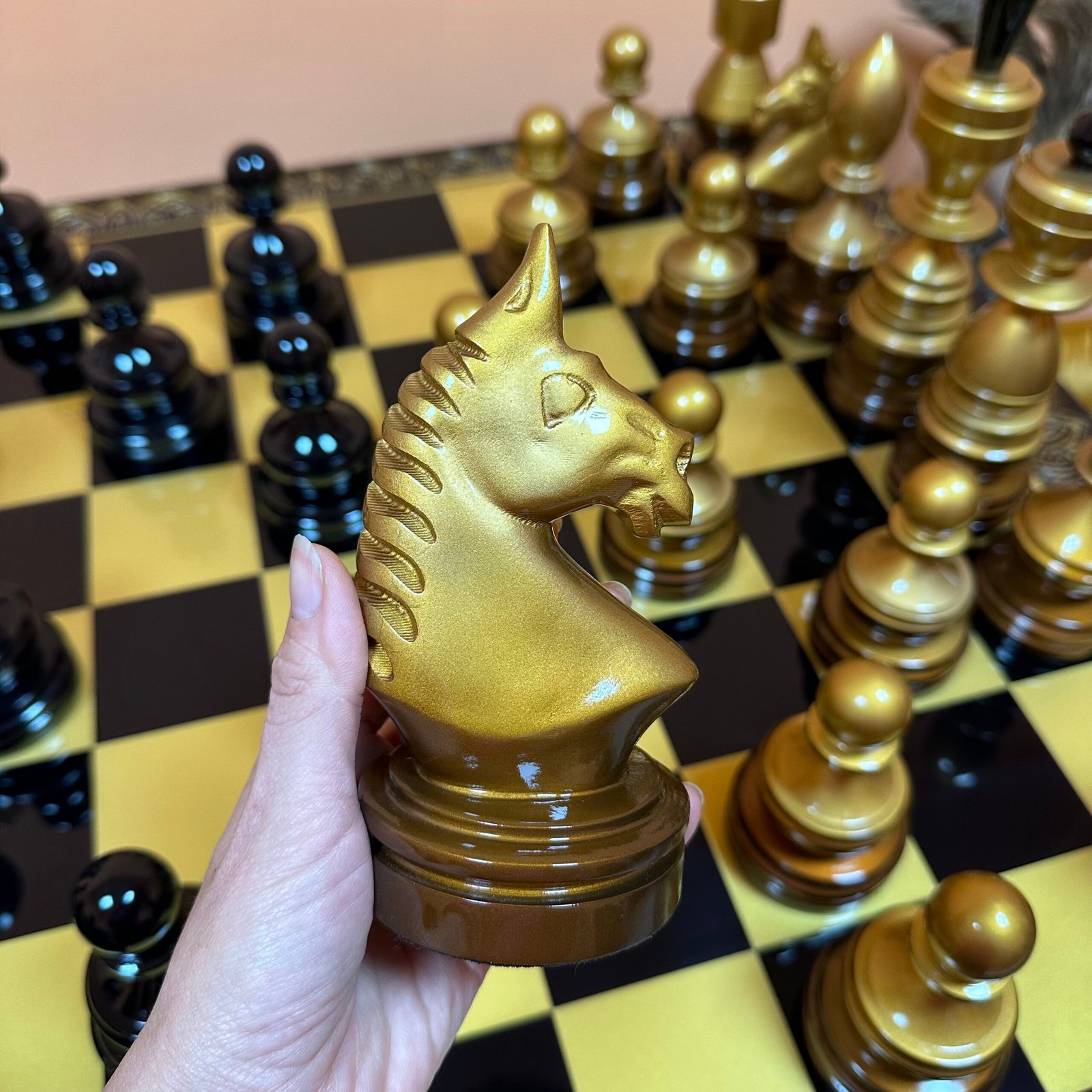 Exclusive large-size chess pieces, designed and created by our brand. They feature an elegant black and gold color scheme and a glossy finish, giving them a luxurious and distinctive look. Each piece is crafted with meticulous attention to detail, ensuring premium quality and an aesthetically pleasing play experience.