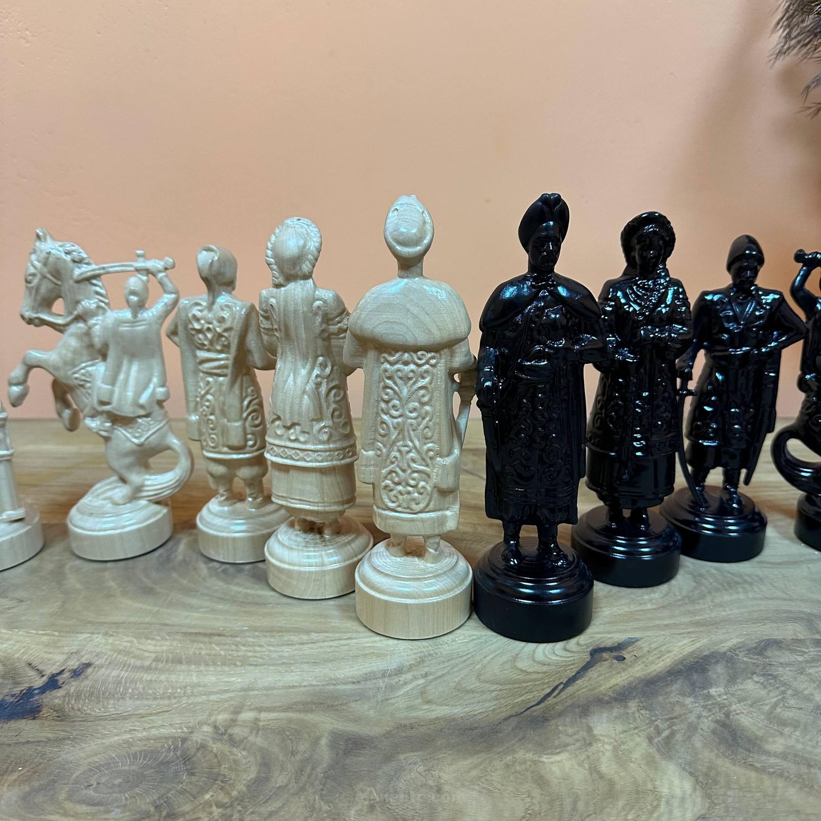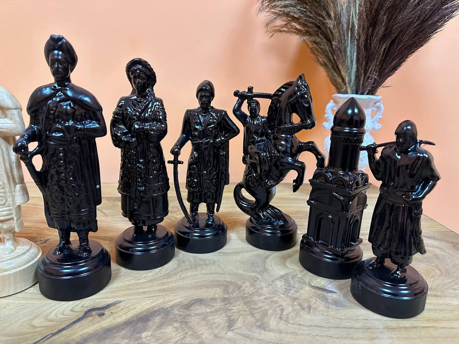 An original set of chess pieces inspired by the Ukrainian Cossacks. Each piece is hand-carved from durable maple and reflects the character and courage of the heroes. The king is the ataman, the main warrior and strategist, and the other pieces are Cossack warriors. The color scheme in in black patina and beige emphasizes the texture of the wood, creating a spectacular collection. This set will not only be the center of attention in any game, but also a unique gift.