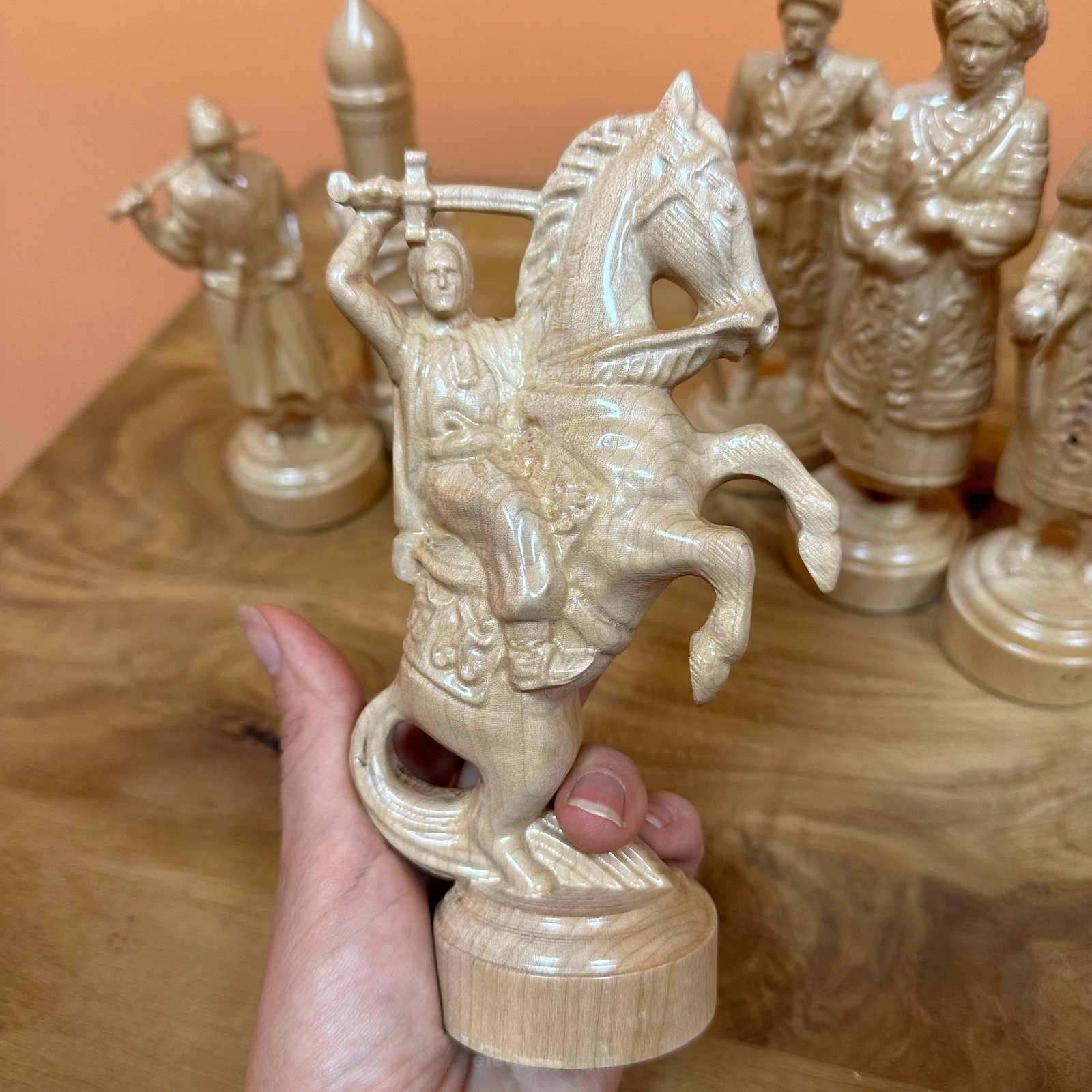 Large chess pieces in the form of Ukrainian Cossacks. Otaman as a king, handmade from maple, premium quality, expressive texture and detailing.