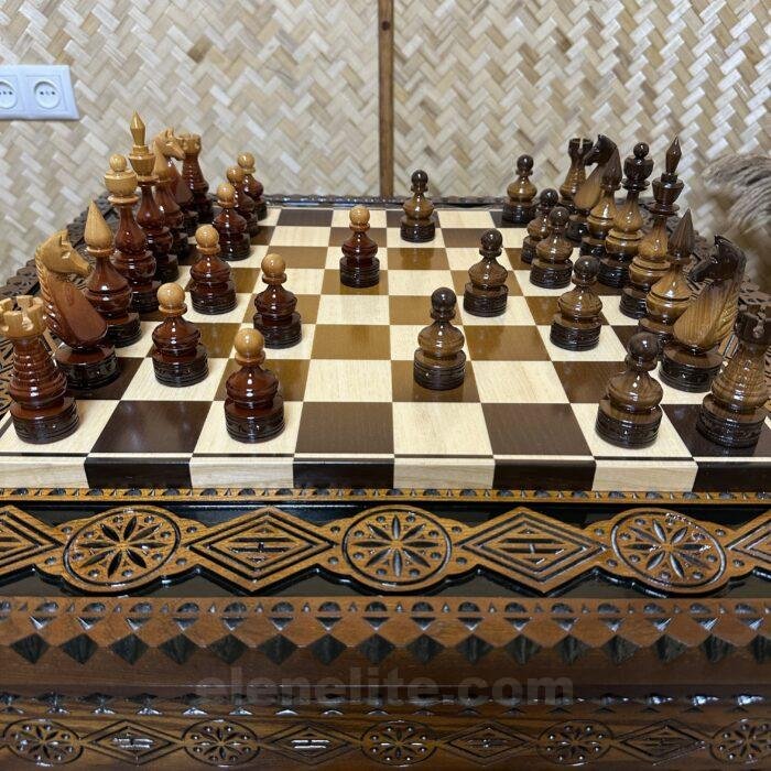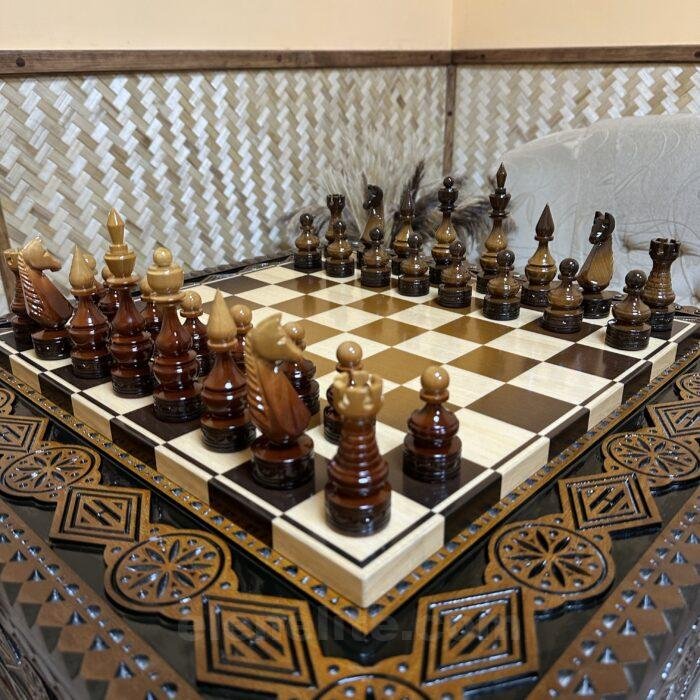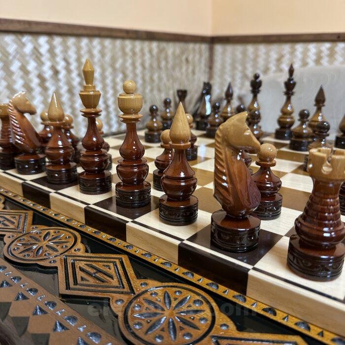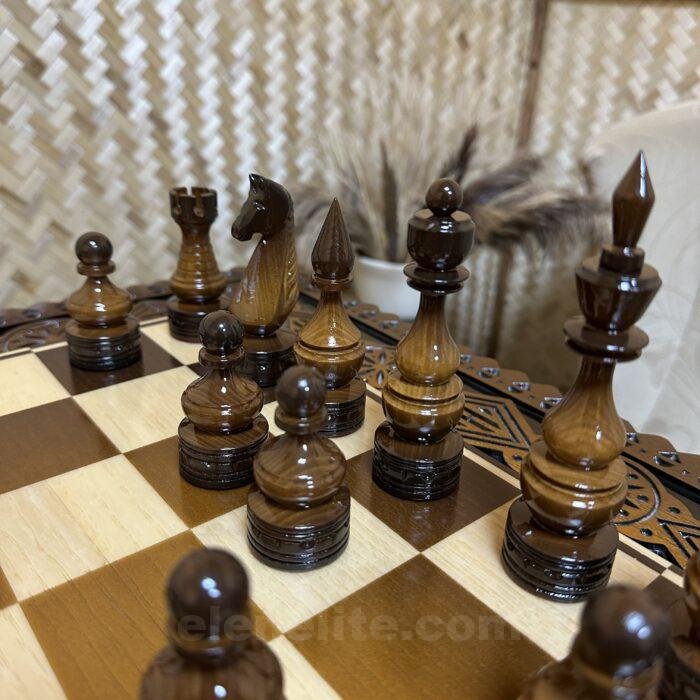 These chess pieces are handcrafted from durable maple. Their signature feature is a stylish ombre finish: one side of the set features a light, smooth transition of shades, while the other features deep, dark tones. This creates a harmonious contrast and lends the game a distinctive aesthetic. The pieces are coated with a high-gloss protective layer that not only highlights the rich color and texture of the wood but also reliably protects the surface from wear.