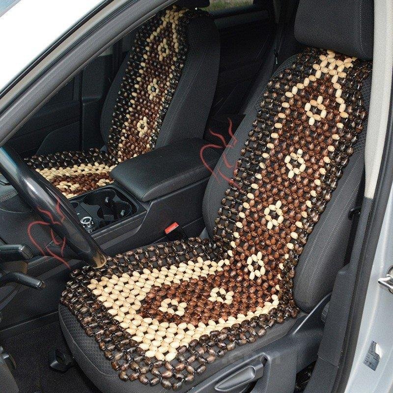 Bought two of these for my Mustang Cobra with black leather seats which were in dire need of some salvation from the heat. The leather used to burn people in the summer and the beads completely solved that issue. These covers have definitely reduced the amount of sweating I get while driving. I can actually feel the air passing behind my back because of the beads. Neglected one star for the following reason. Beware, if you go to the beach! Wet, light colored clothing will get stained from the dye on these beads. Lay down a towel or remove the covers for a beach or pool trip. Also, no one really notices the snake, but I know, and that’s what matters. Passengers do enjoy the beaded cover, despite the few pinches.