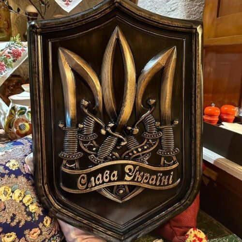 The “Coat of Arms of Ukraine” wooden decor is handcrafted from premium natural ash. The shield features swords and an image of the Ukrainian Trident, the symbol of Ukraine. Finished with a semi-gloss protective coating, it’s perfect for a stylish and symbolic interior.