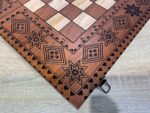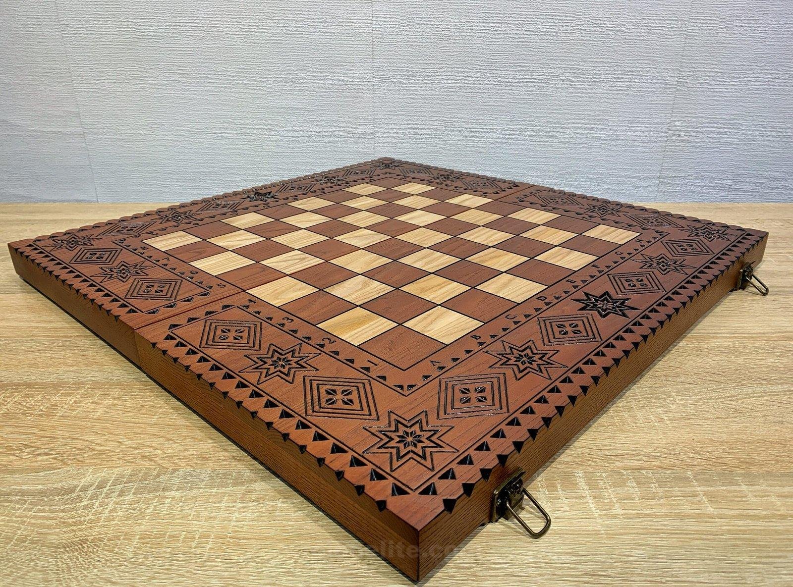 A unique Folding Chess board, created with love for the game and attention to detail. Handmade from high quality ash wood. This board is not just a game board, it is a work of art with a unique design inspired by Ukrainian symbols. In her heart is the Star of Life, symbolizing a long and happy life.
