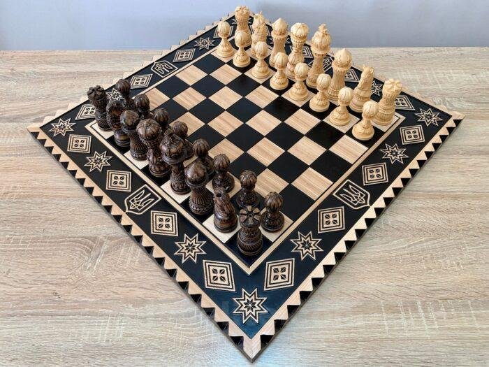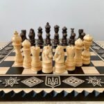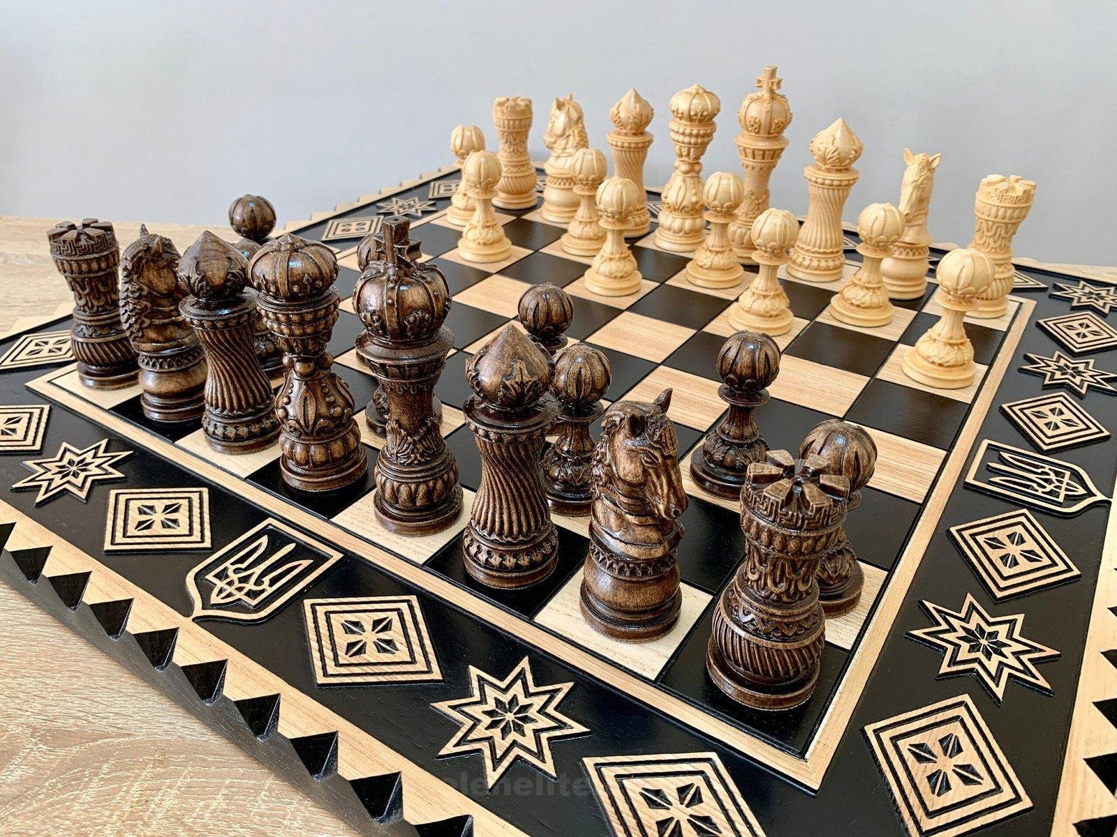 Handcrafted chess set with an ash board decorated with carvings inspired by Ukrainian culture: the eight-pointed star of life and the Ukrainian coat of arms – the Trident. Classic maple pieces complete the exquisite design.