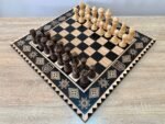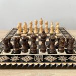This unique chess set combines the art of wood carving and the symbolism of Ukrainian culture. The ash board is hand-decorated with an image of the eight-pointed star of life – an ancient sign of birth, harmony and spiritual balance, as well as the coat of arms of Ukraine – the Trident. Classic maple pieces organically combine with the design of the board, creating a harmonious set.