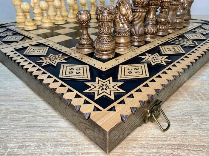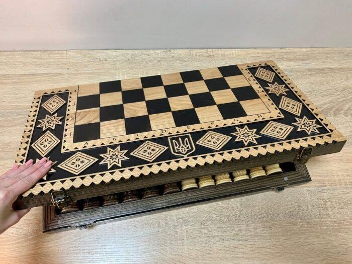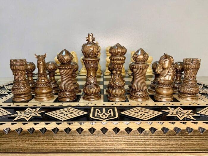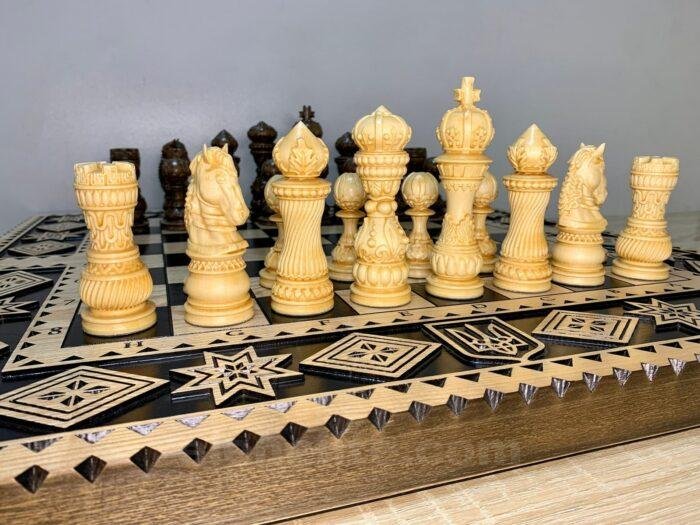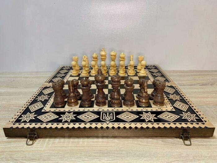 DESIGN: folding board with velour storage, carved patterns of eight-pointed stars and Ukrainian Trident; the chess pieces are made in a classic design; exclusively designed by our “Elen Elite” craftsmen.