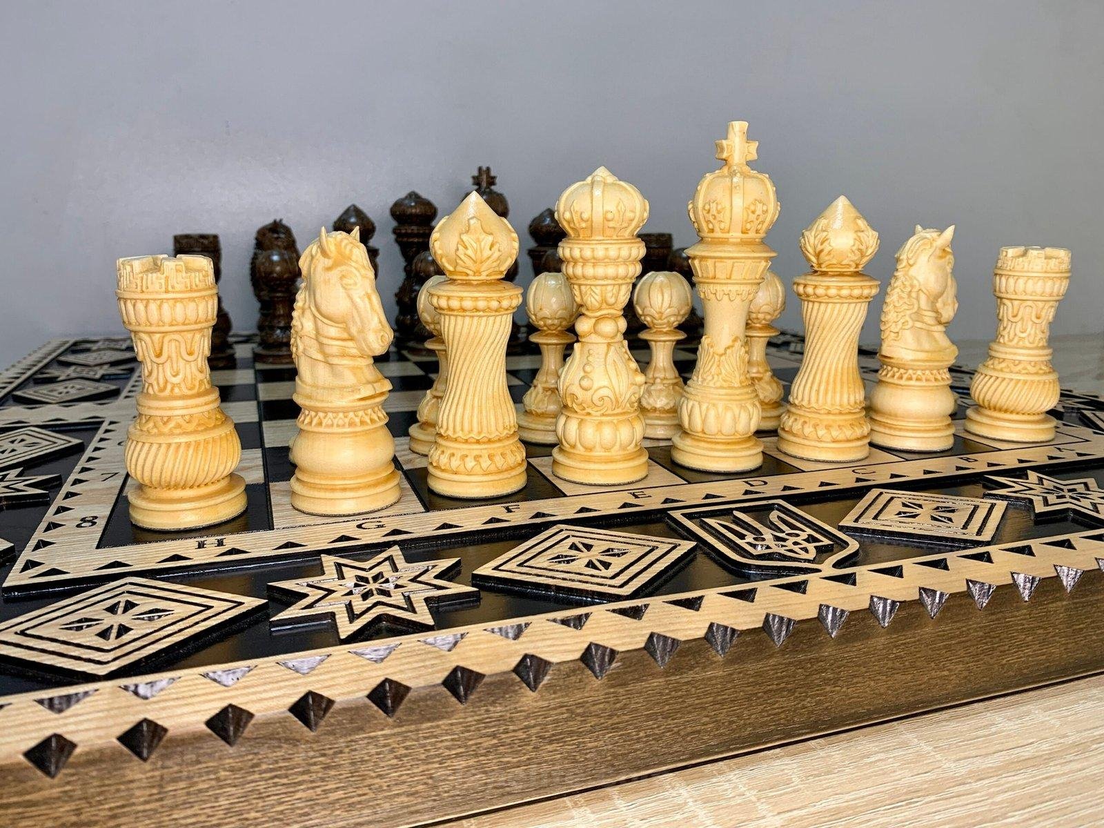 This chess set combines functionality and artistic craftsmanship. The folding board with a soft inner compartment and velour lining securely stores the pieces, protecting them from scratches and damage. The board is decorated with neat carvings, and the unique design combines an ancient Ukrainian symbol – an eight-pointed star – and the Coat of Arms of Ukraine, giving the set a unique character. The set also includes chess pieces that are perfectly matched in color and style. An ideal gift and stylish accessory for true chess lovers.