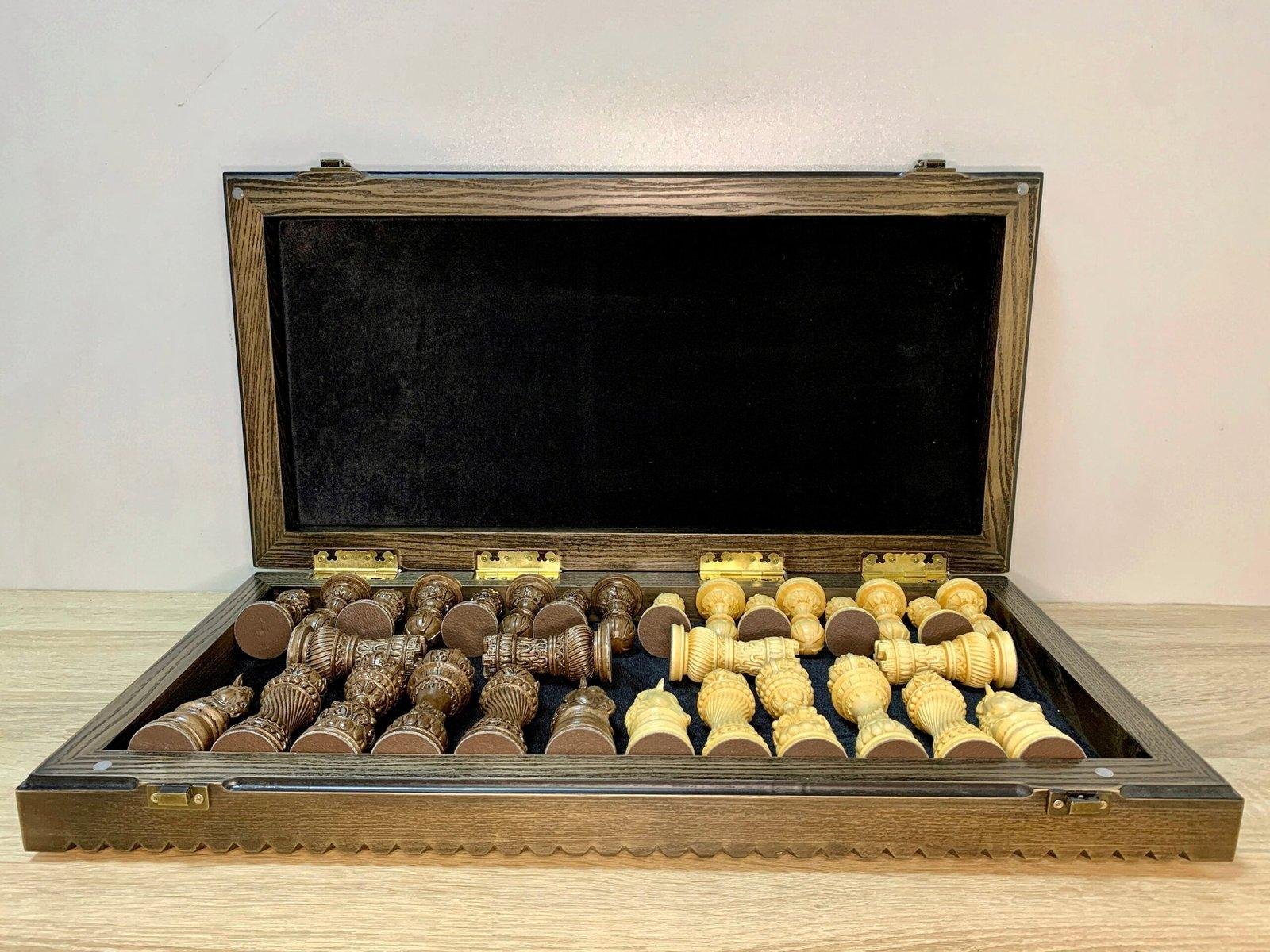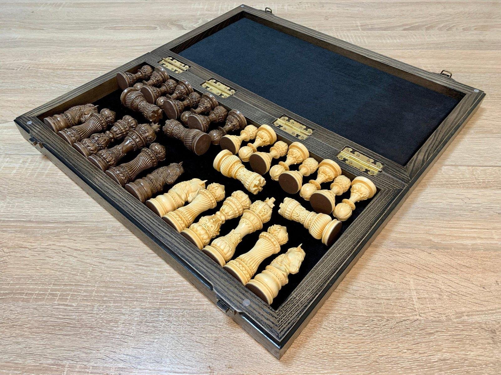 Folding ash board with velvet storage for pieces. Reliable fittings, dark brown color, neat carving and markings - everything for the convenience and aesthetics of the game.