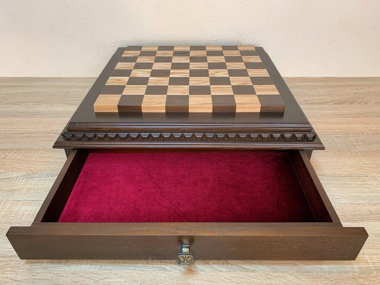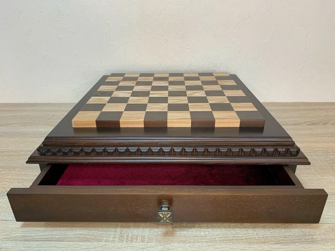 The board’s design is thoughtfully crafted for maximum comfort: two drawers are located on the right and left sides, providing easy access to the pieces during play. The drawers have additional support, allowing for comfortable support during play.