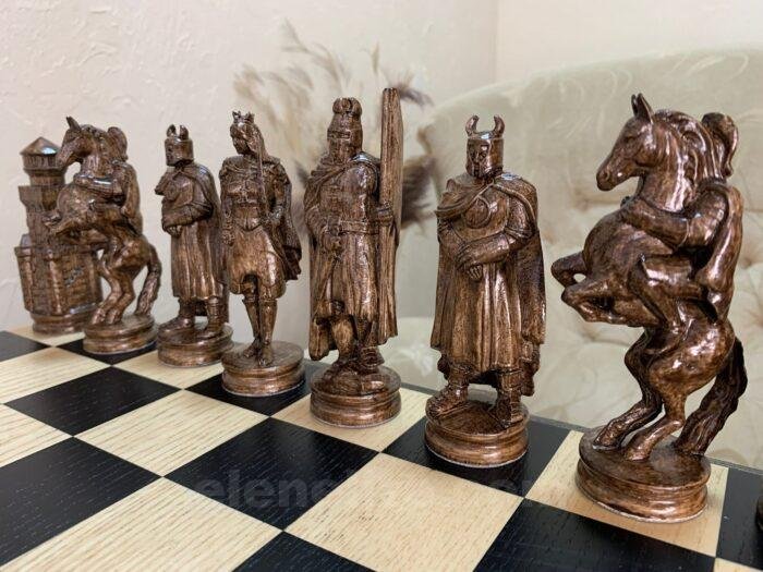 A chess set with a unique ash table in the “black patina” technique and a removable board. The set includes 32 exclusive chess pieces: knights and Ukrainian Cossacks, handmade with detailed elaboration.