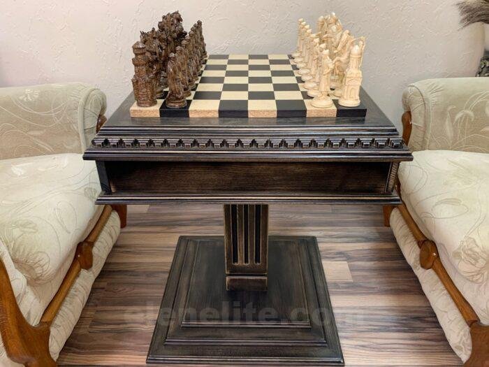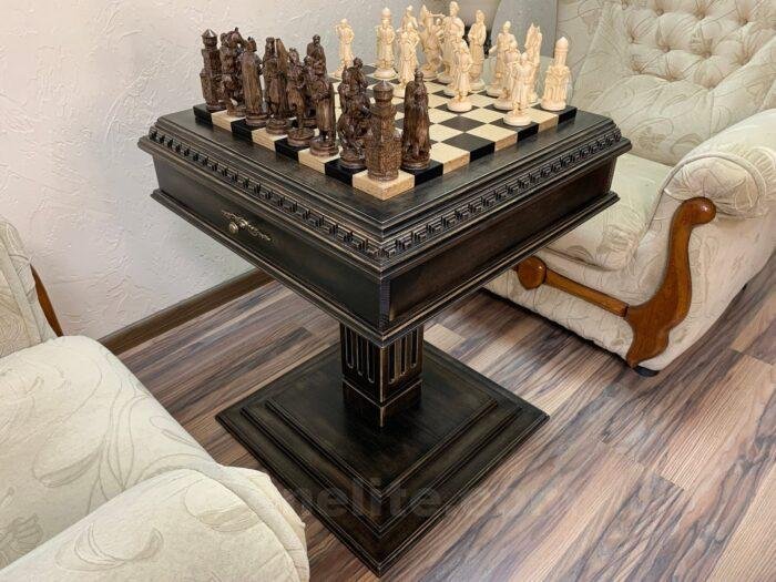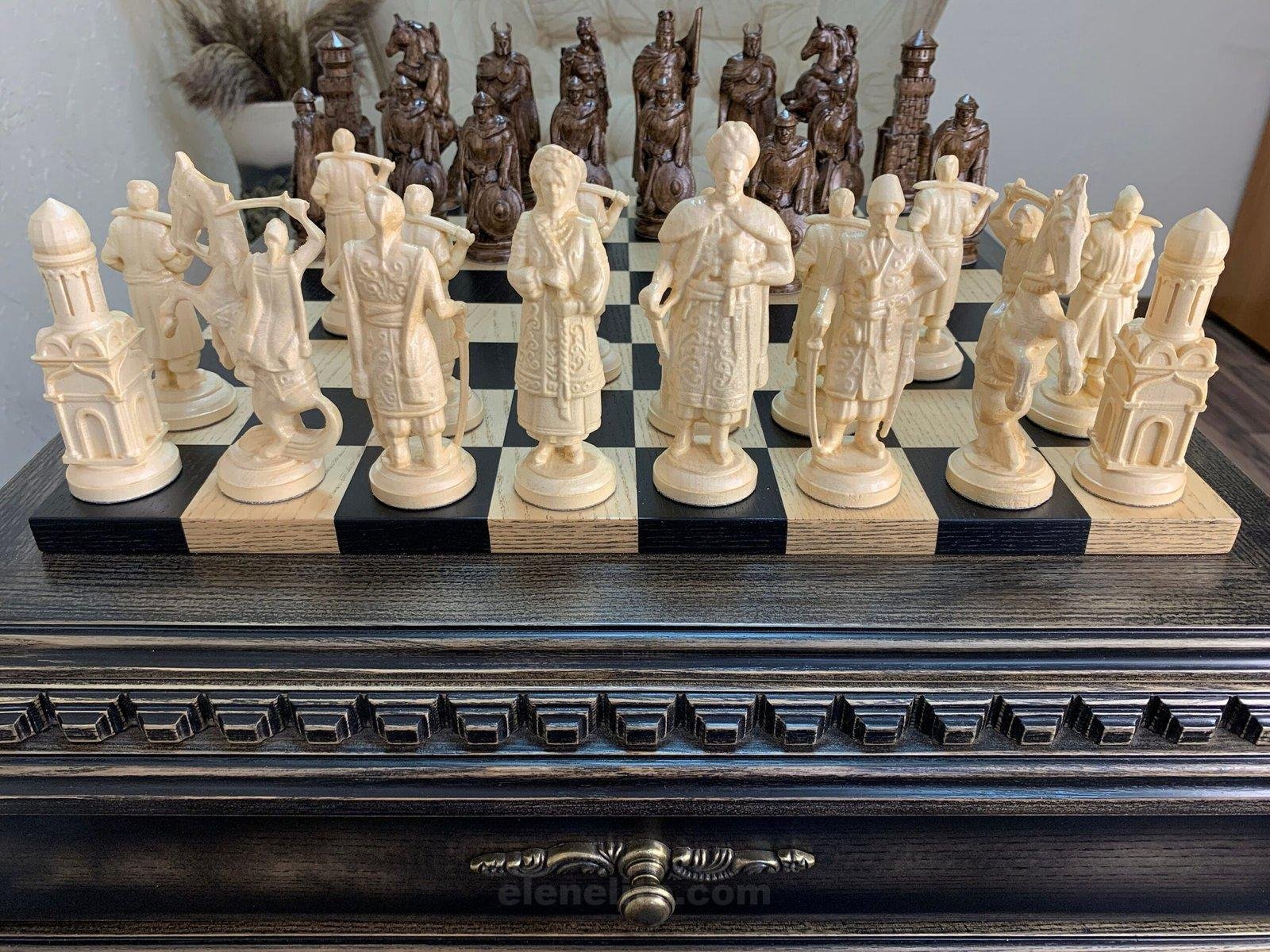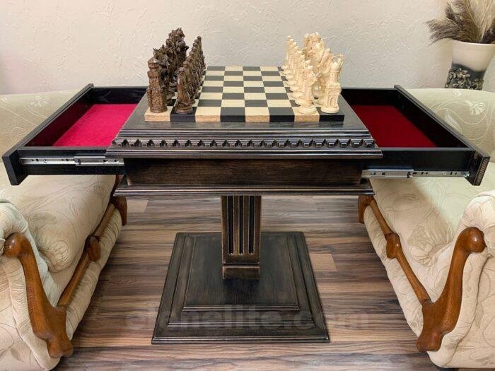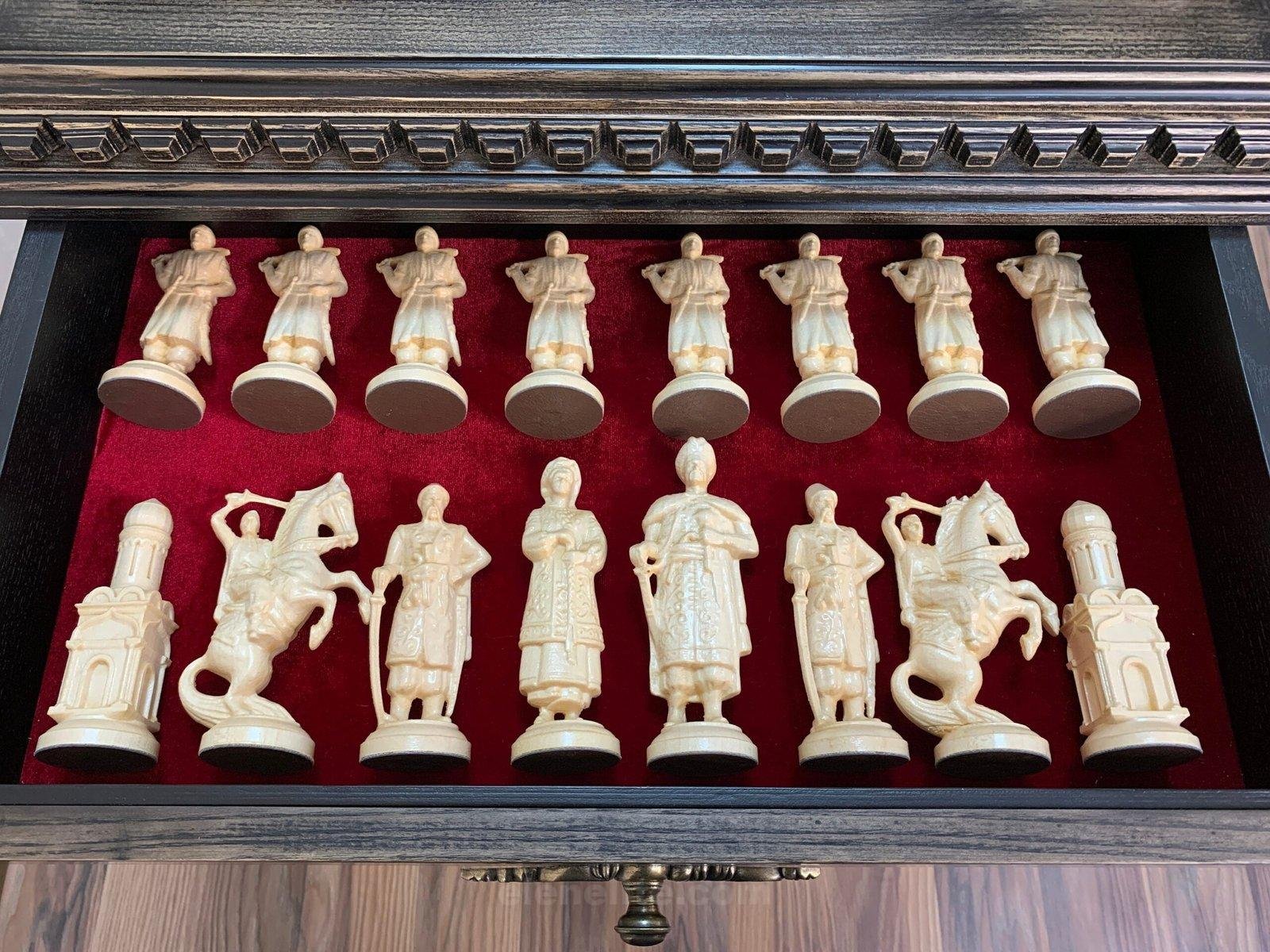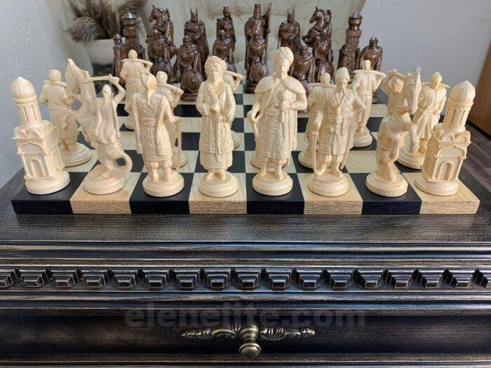 DESIGN: the board is equipped with 2 drawers for storing chess pieces; 16 pieces – Ukrainian Cossacks and 16 pieces – Knights; exclusively designed by our “Elen Elite” craftsmen