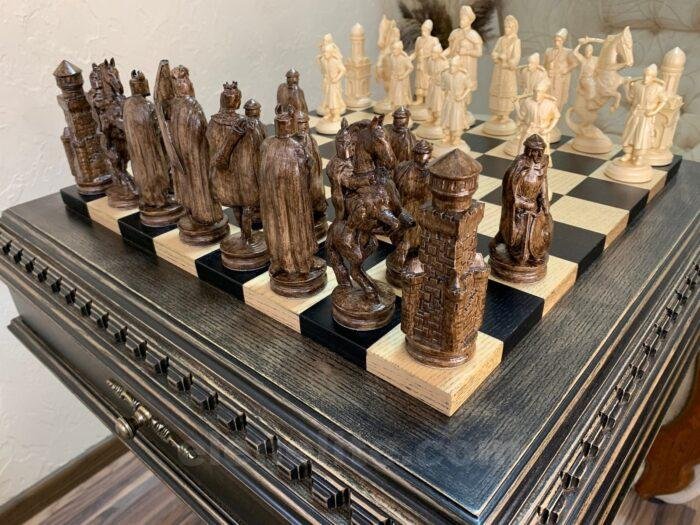 This chess set will decorate any interior. The table is made of natural ash, hand-made, covered with a matte patina, which emphasizes the natural texture of the wood. The design is complemented by two pull-out drawers with a velvet lining inside. The low leg makes the game comfortable, and the removable board allows you to use it separately, adding functionality. The main decoration of the set is 32 handmade chess pieces. 16 chess pieces depict knights, and another 16 – Ukrainian Cossacks. Each detail of clothing, weapons and appearance is made with filigree precision, turning the figures into real miniature works of art.