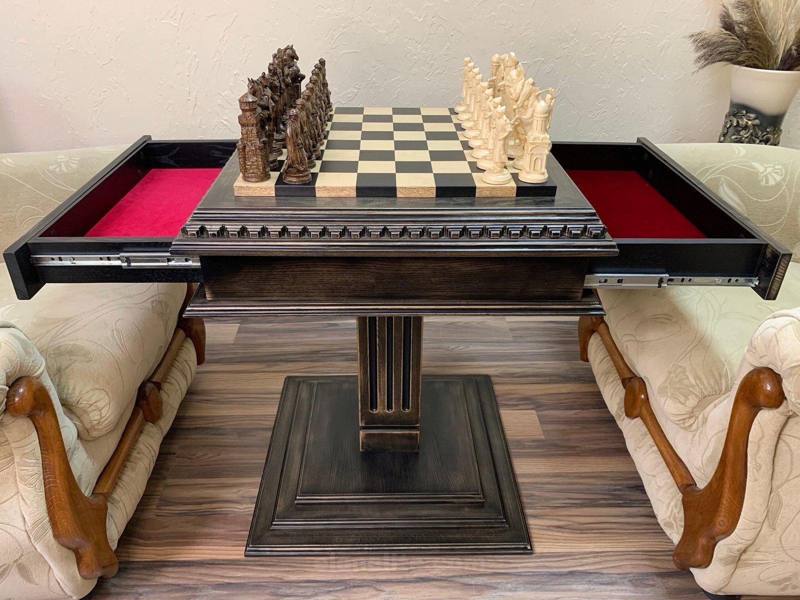 Chess Set : Wooden Chess Table “Black stone” with drawers and a Low leg + pieces “Cossacks” & “Knights”