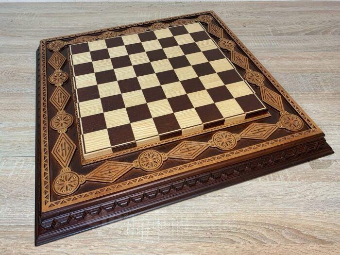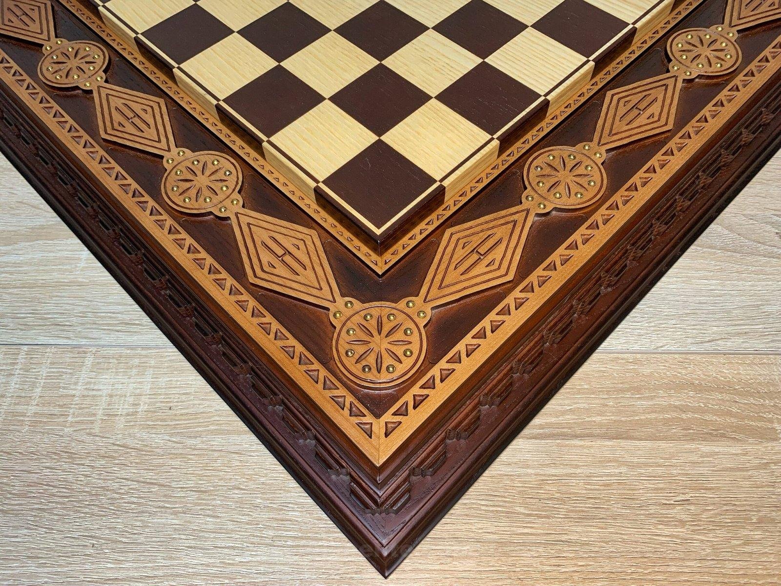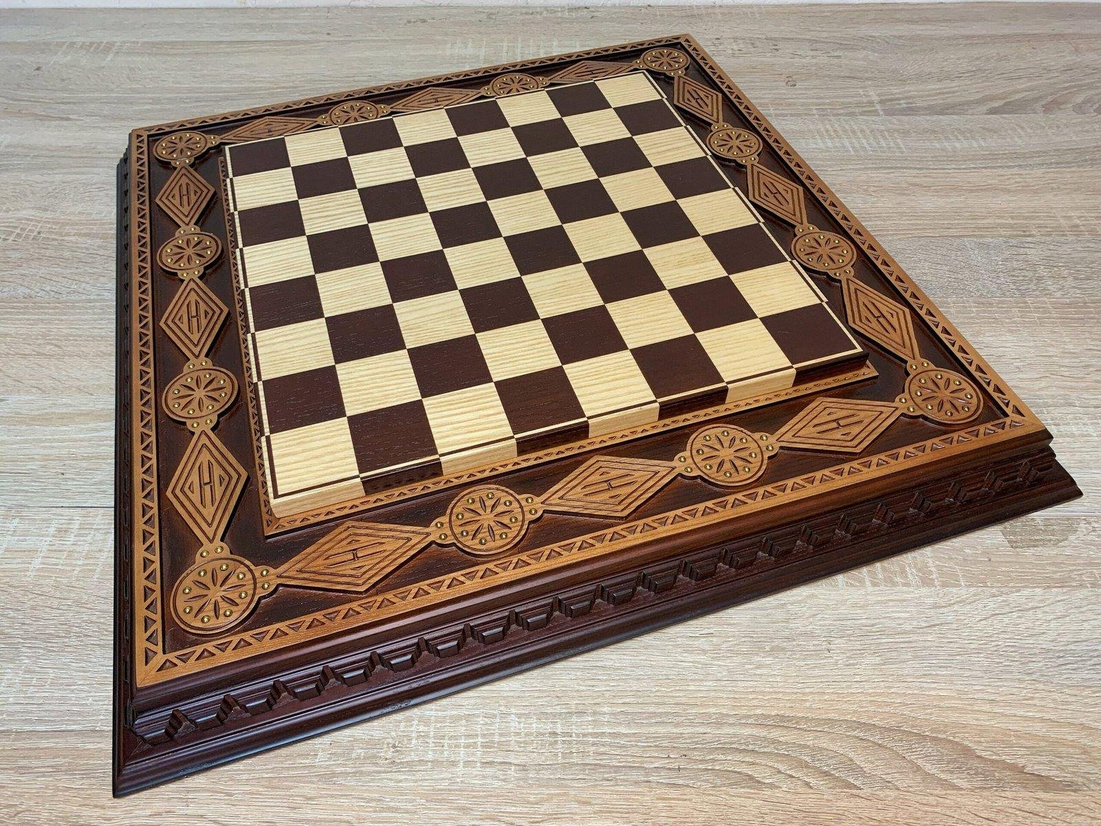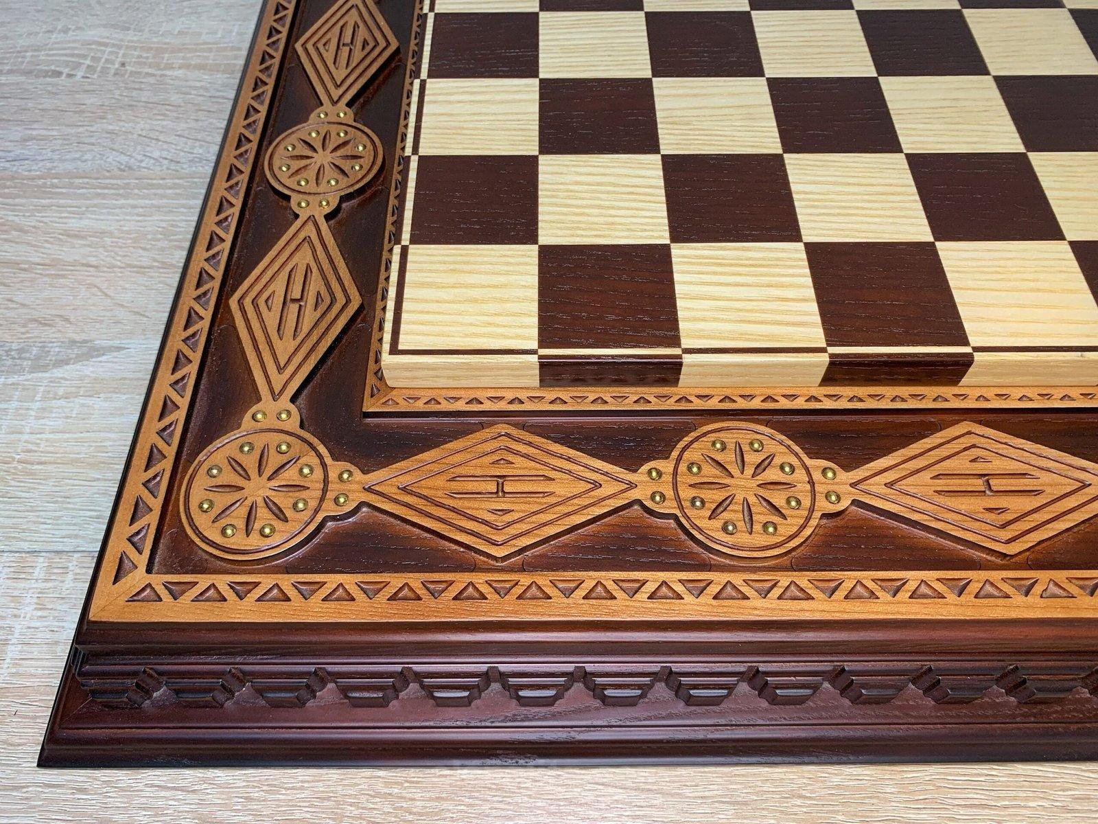 A unique chess board, handcrafted with exquisite carving. Decorative beads, carefully placed on the surface, give the product an exquisite and unusual look. This board will emphasize your taste and will become a worthy element of a collection, a gift or an interior decoration.