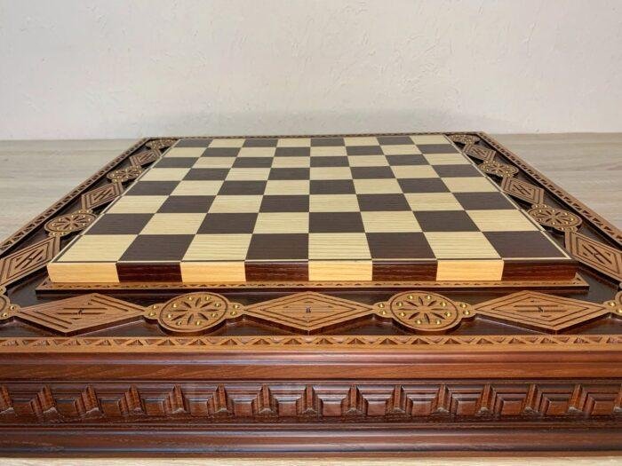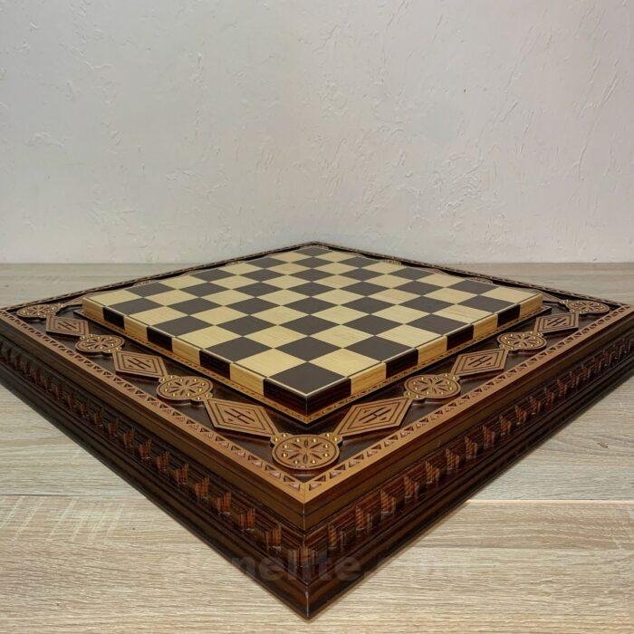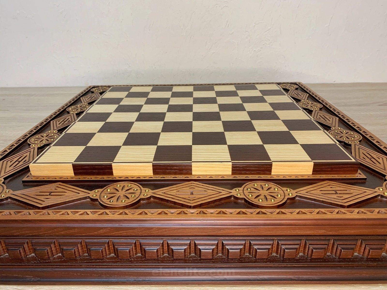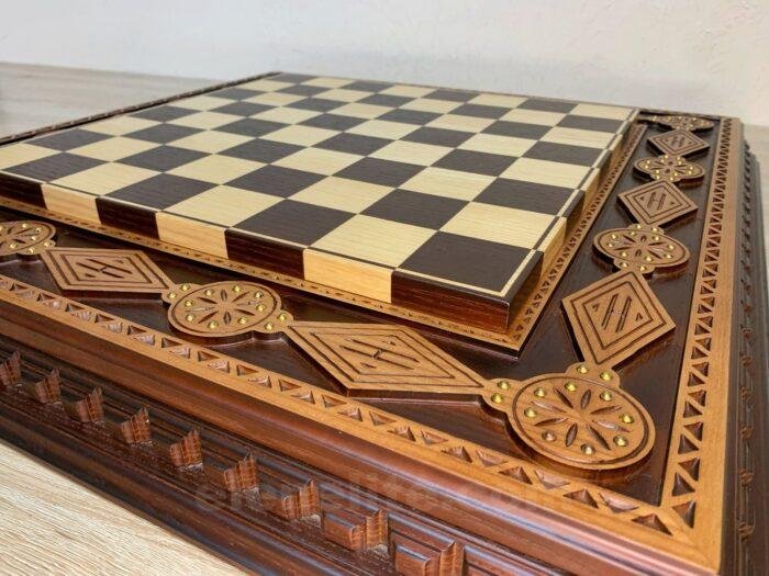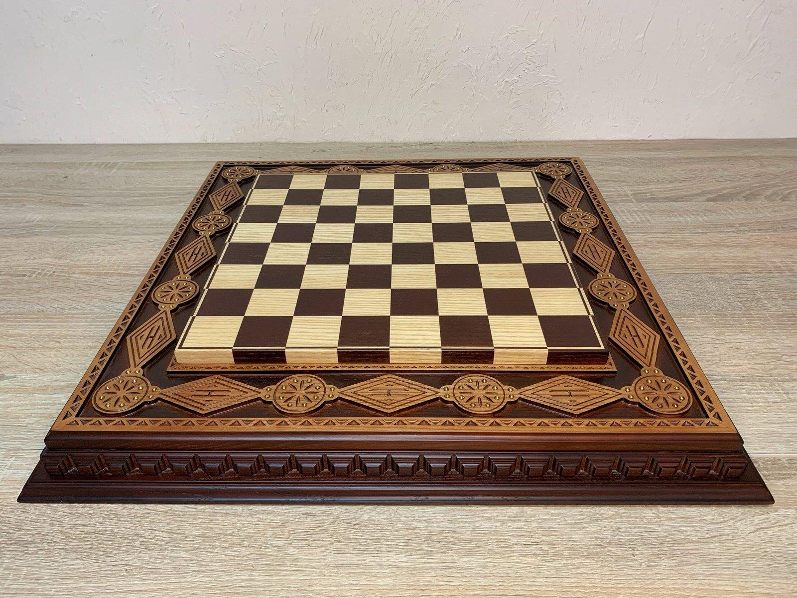 A unique chess board, handcrafted with exquisite carving. Decorative beads, carefully placed on the surface, give the product an exquisite and unusual look. This board will emphasize your taste and will become a worthy element of a collection, a gift or an interior decoration.
