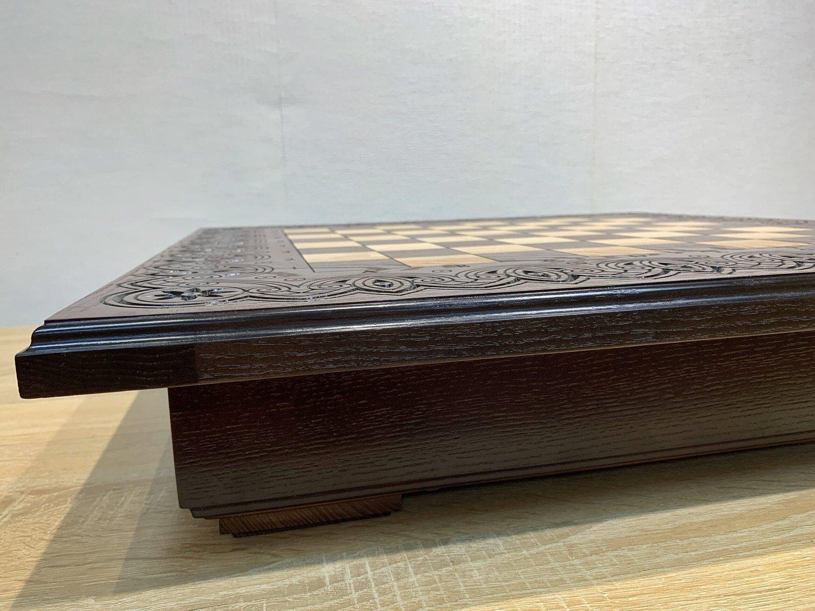 Functional and beautiful chess board with storage inside and intricate hand-carved accents.