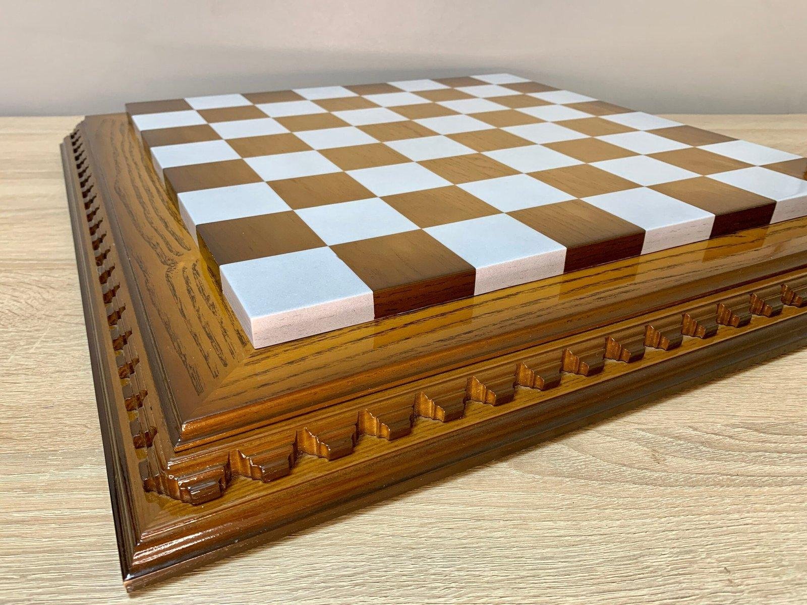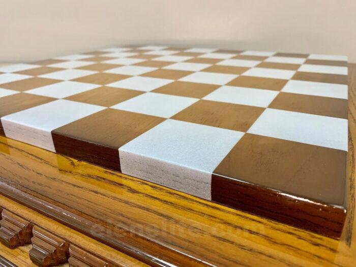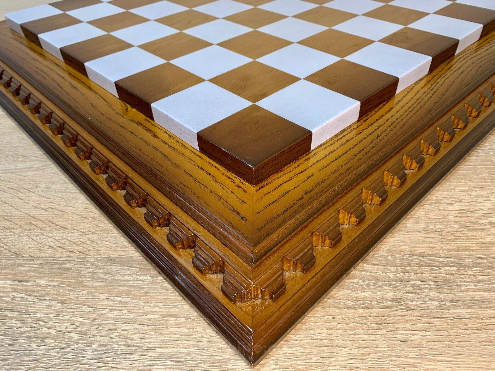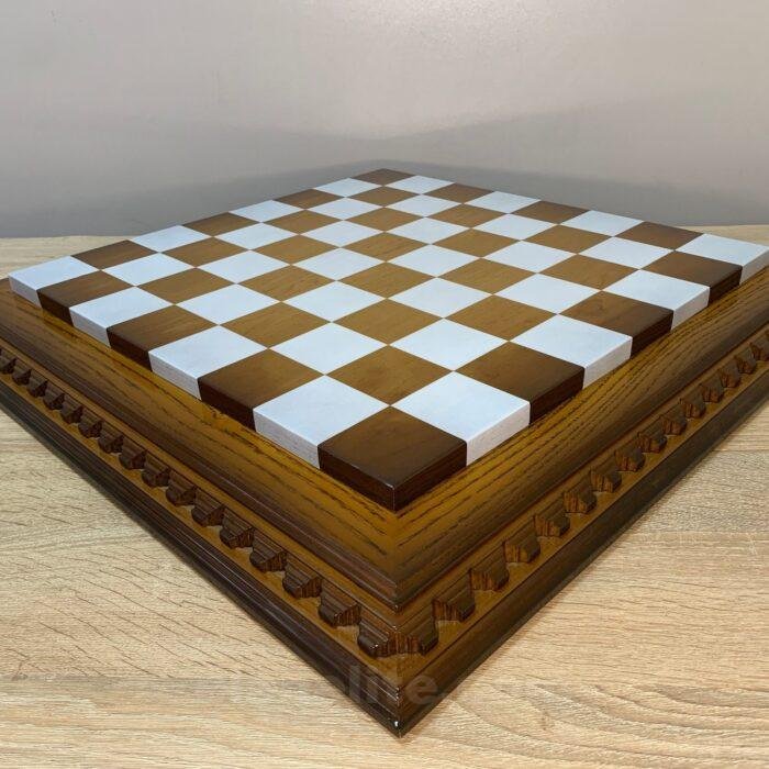 Ash chess board with a spectacular ombre colour from dark to light brown, decorated with carvings and covered with a super-gloss varnish – elegance and shine in every detail.