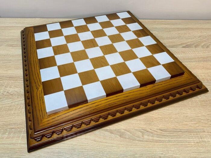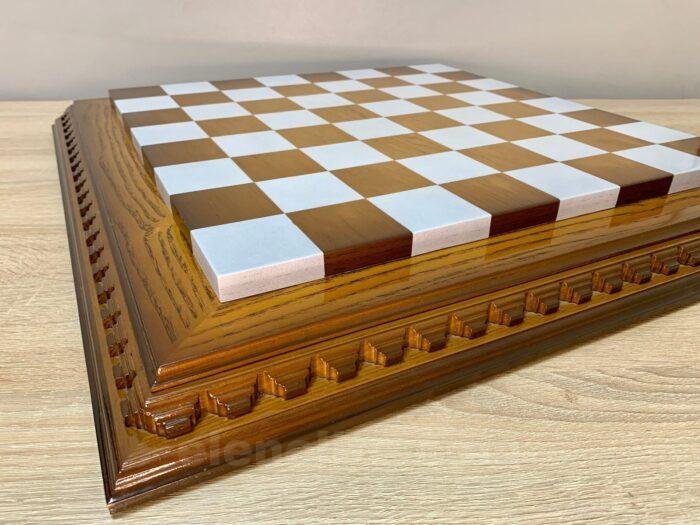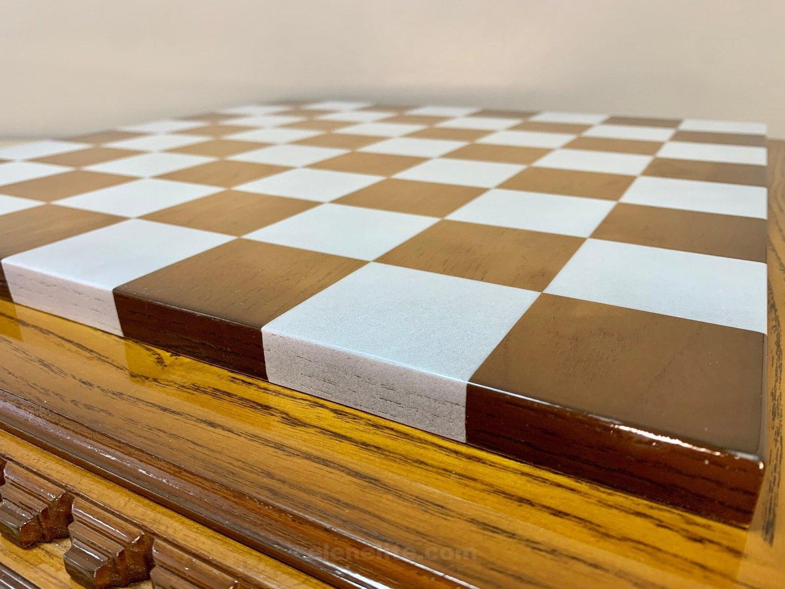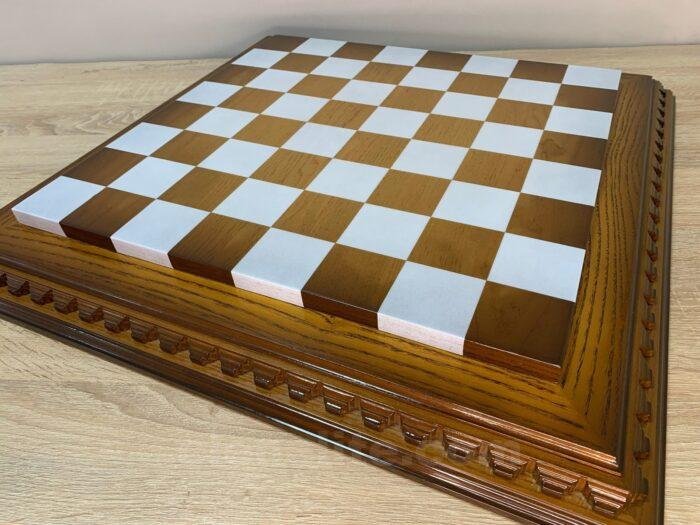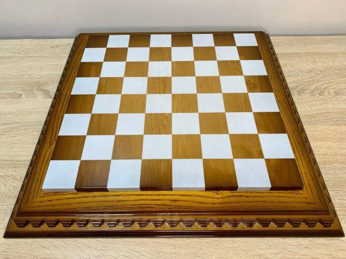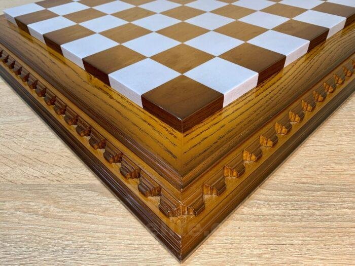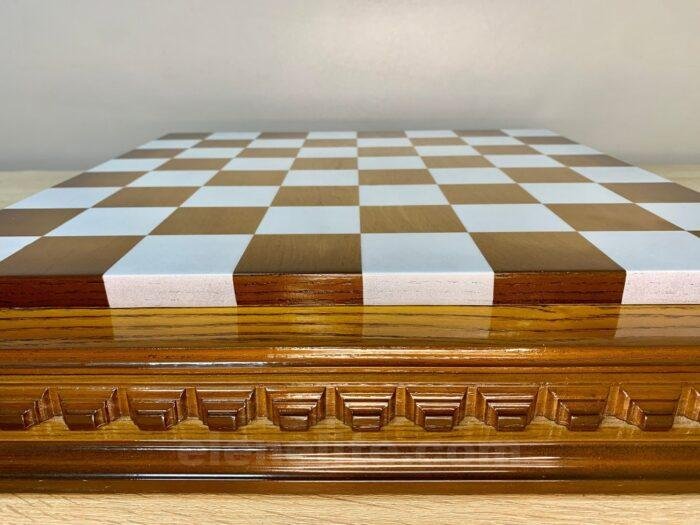 Ash chess board with a spectacular ombre colour from dark to light brown, decorated with carvings and covered with a super-gloss varnish – elegance and shine in every detail.