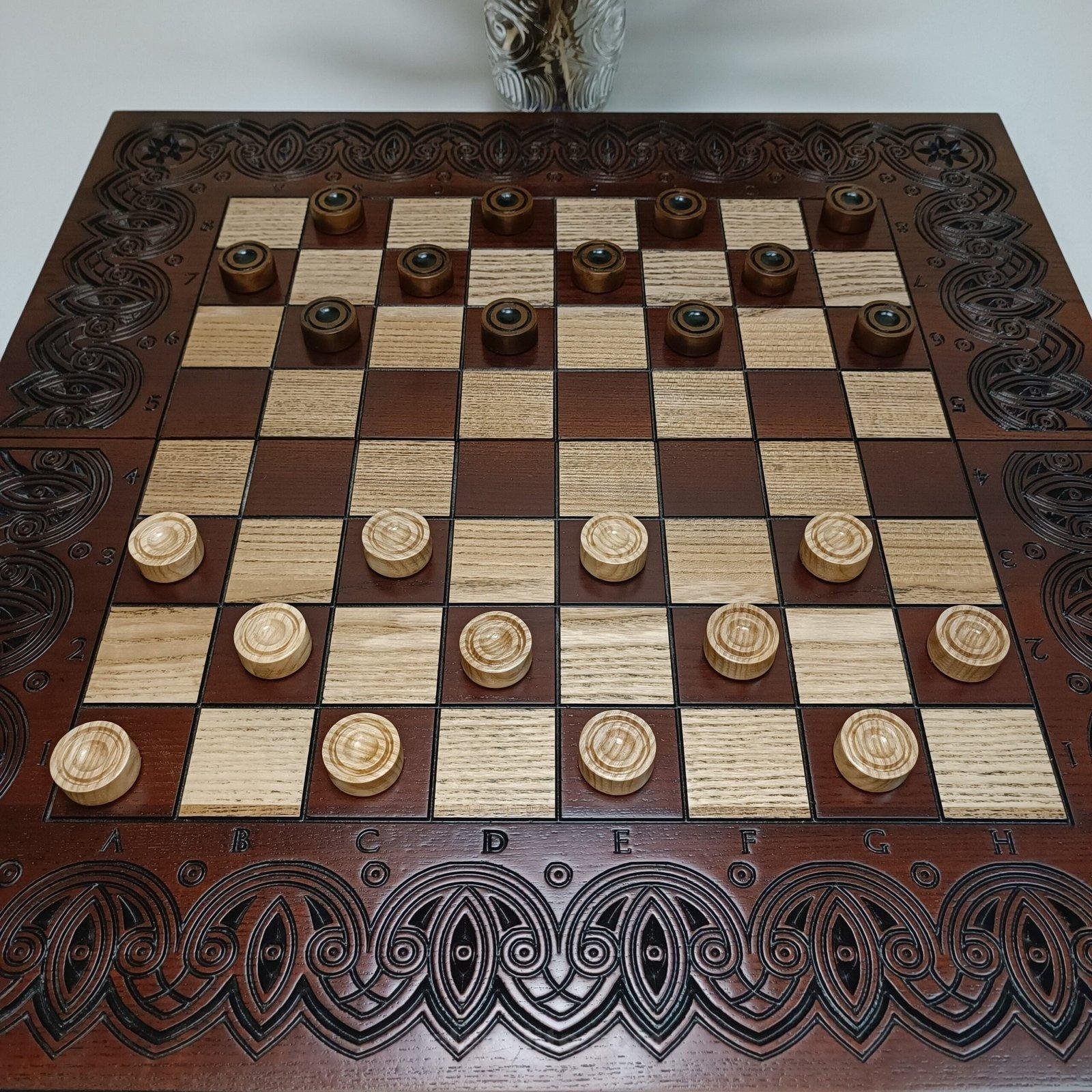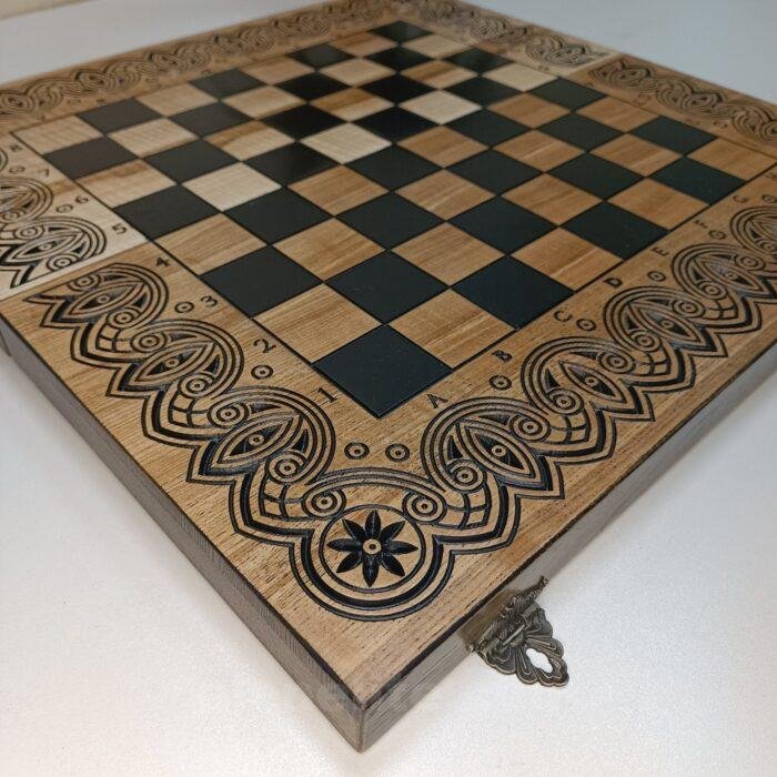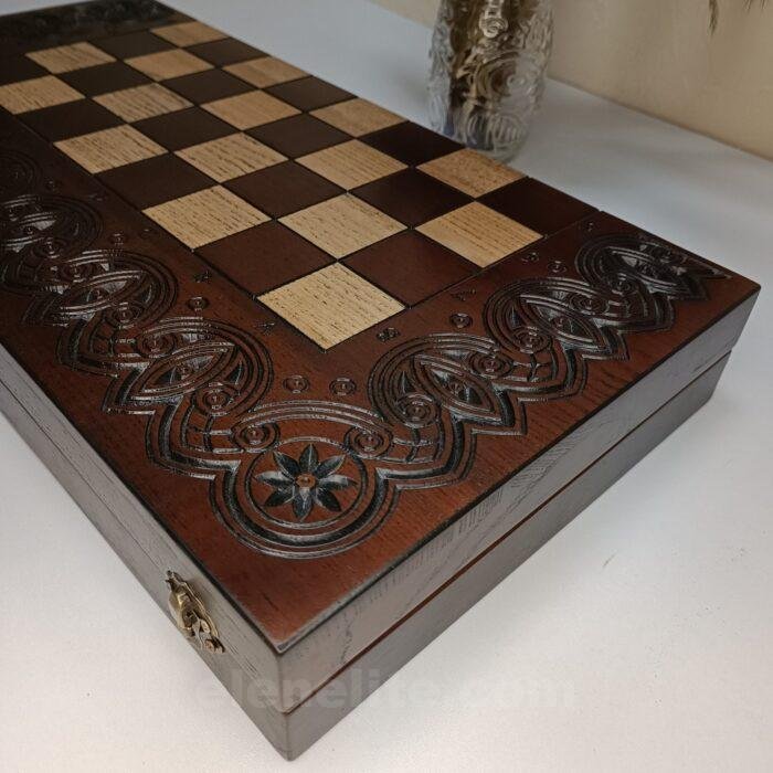 Universal game set 3 in 1 – chess, checkers and backgammon. The folding board is made of ash and decorated with exquisite carving.