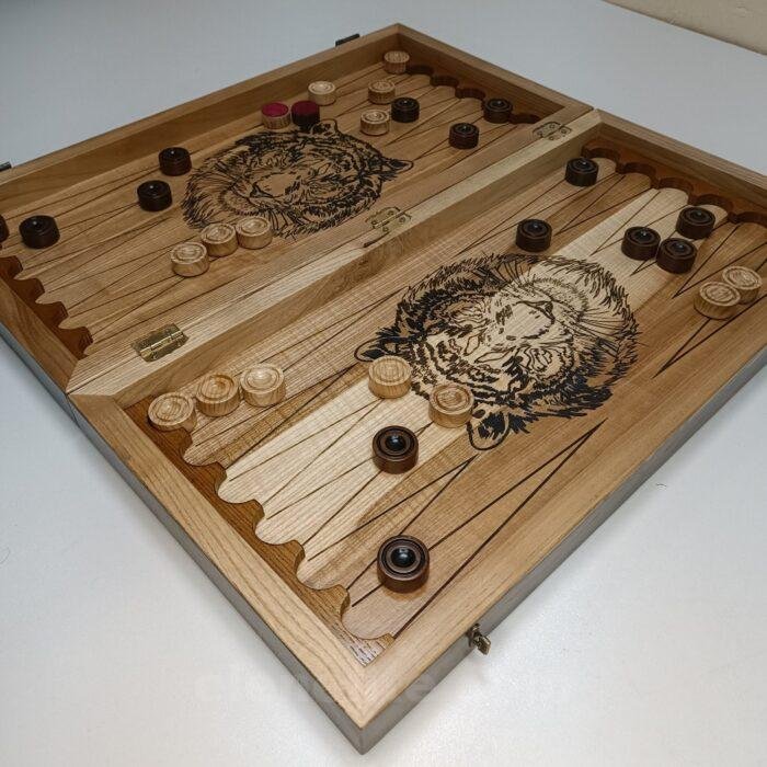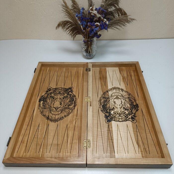 This exquisite 3-in-1 wooden board is the perfect solution for fans of intellectual games. Chess, checkers and backgammon are combined in one product. The board is handcrafted from natural ash, decorated with carvings and supplied with high-quality fittings. Inside there is a backgammon playing field and a spectacular image of a tiger, which gives the board a special character. Compact and practical, it will be an excellent choice for home, travel or as a gift.