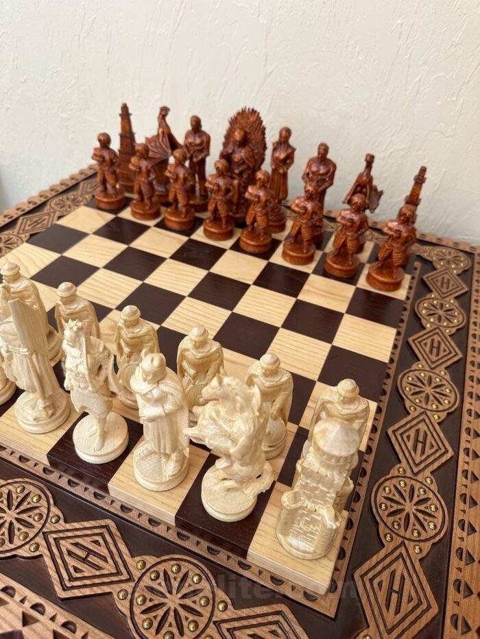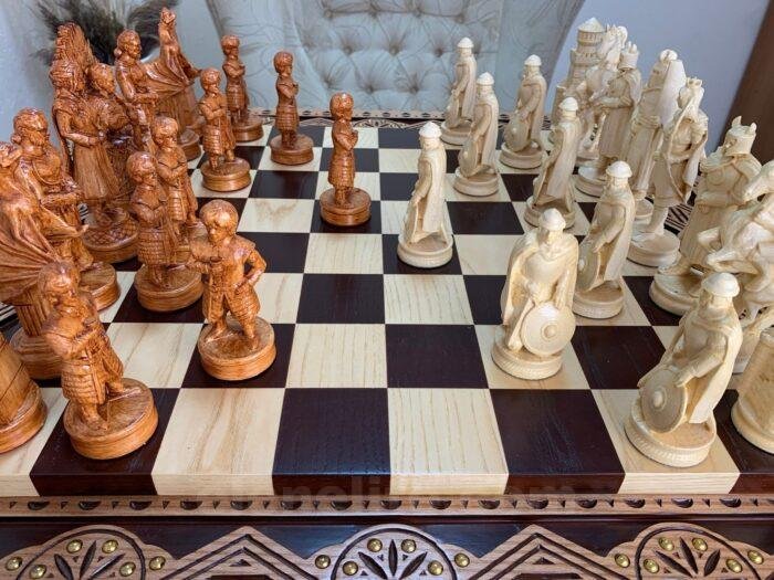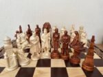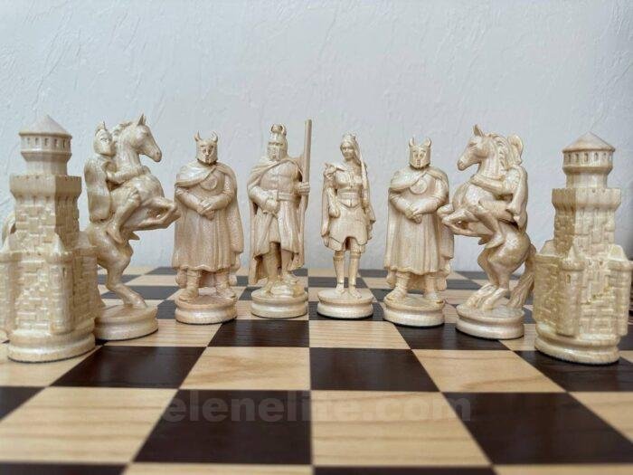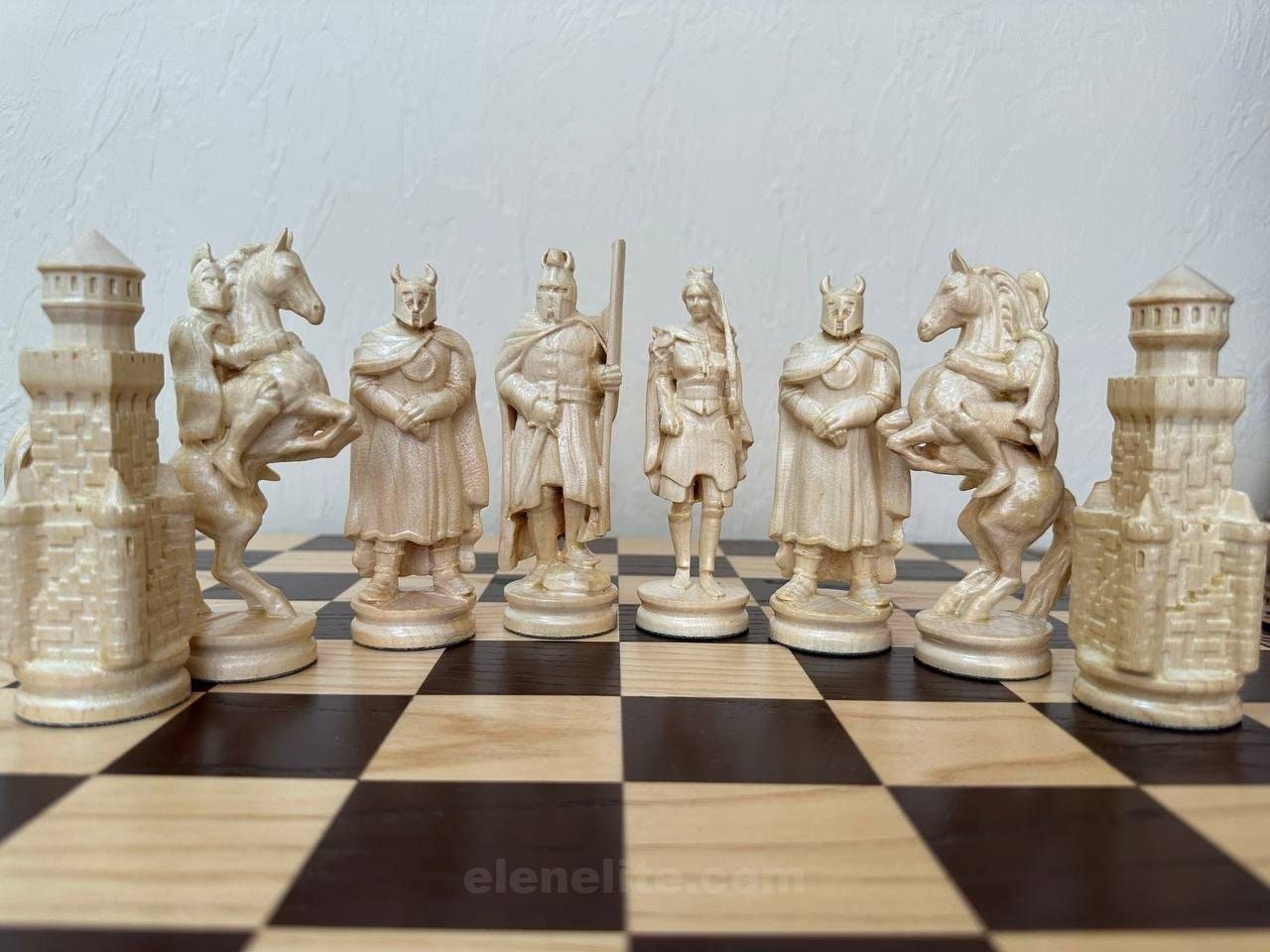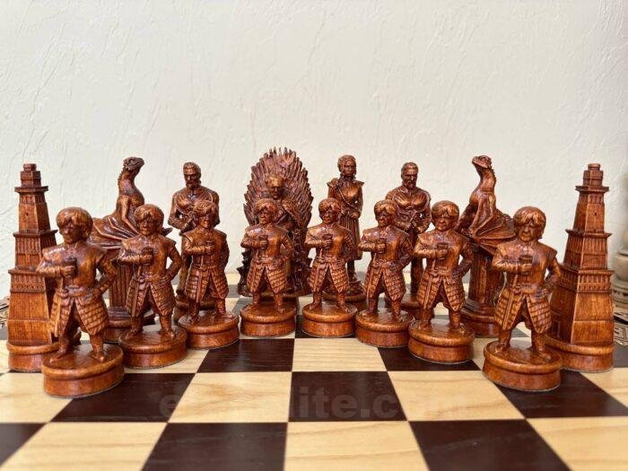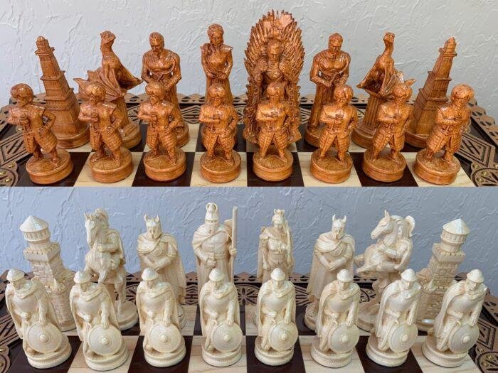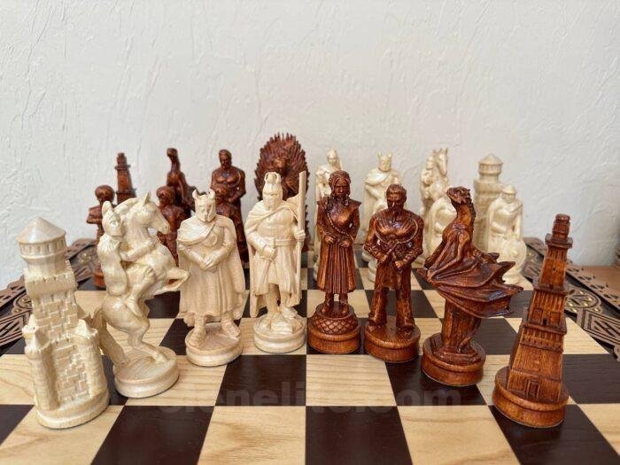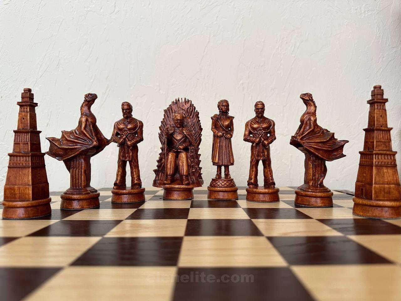 A unique set of 32 handcarved maple chess pieces: 16 Knights and 16 Game of Thrones characters. Detailed carving, premium quality materials, stylish contrast and a great gift idea.