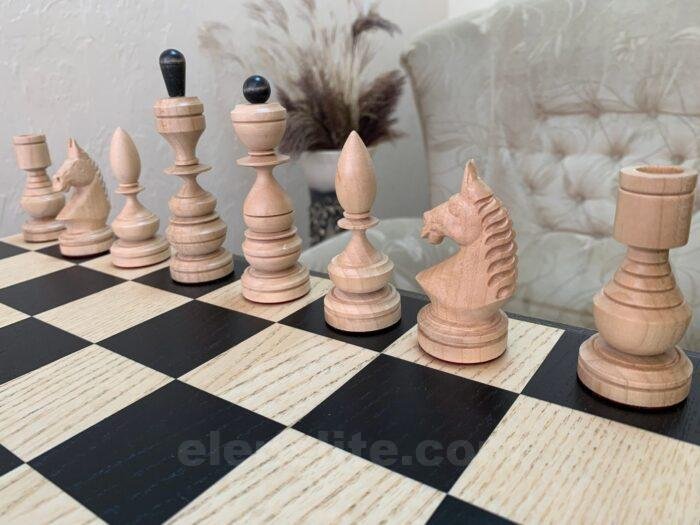 The chess pieces in the colors “black stone” and beige are created for those who appreciate discreet elegance. Handcrafted from natural maple emphasizes the exquisite style and high quality of the set. Precise carving, smooth texture and deep contrasts make the pieces expressive and easy to distinguish on the board. The perfect choice for a classic game in a modern version.