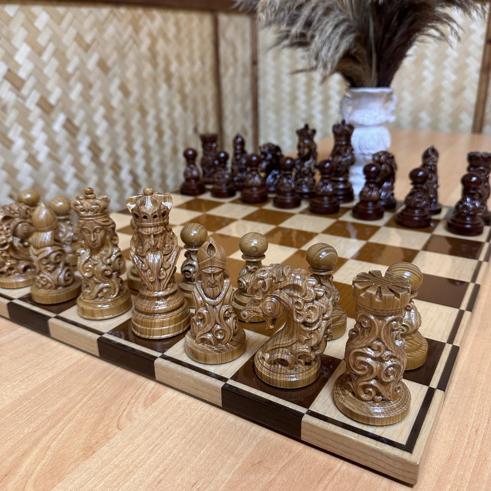 Handcrafted maple chess pieces in ethnic Slavic style. Classic design with ornaments, unique images of the Wise King and royal characters. Each piece is uniquely handcrafted.