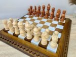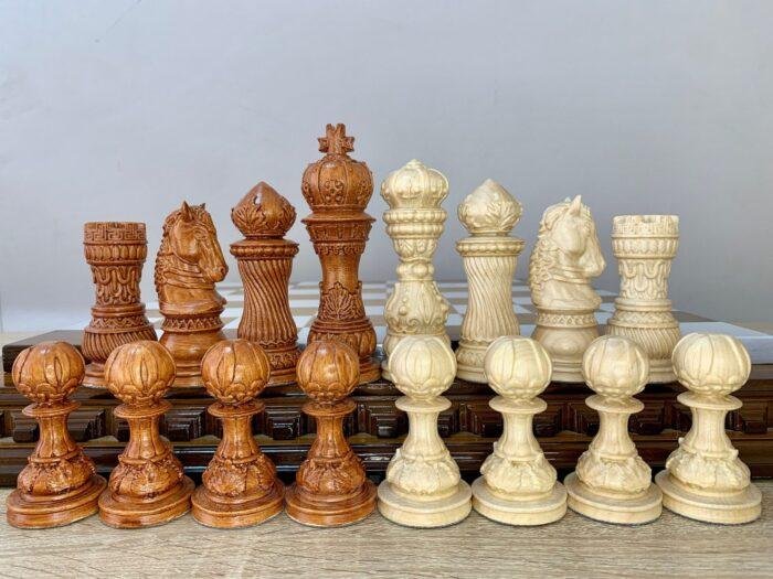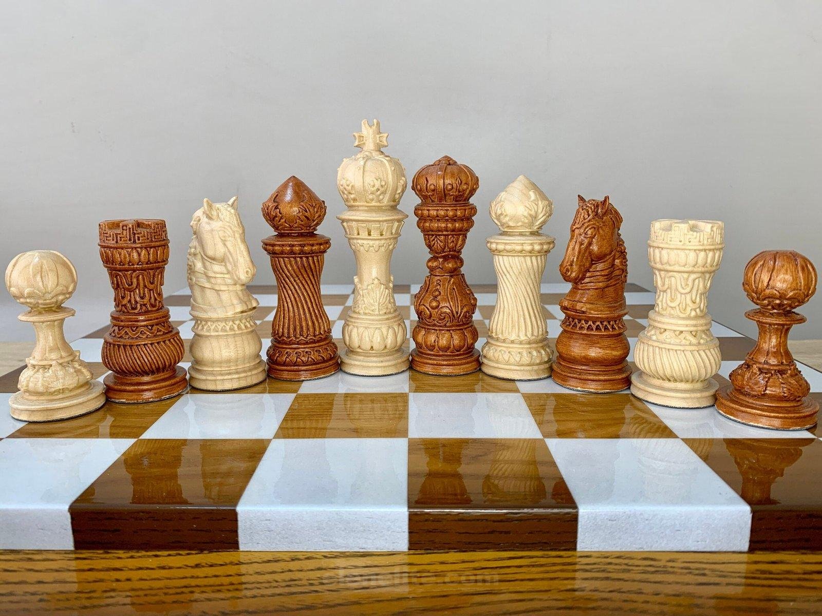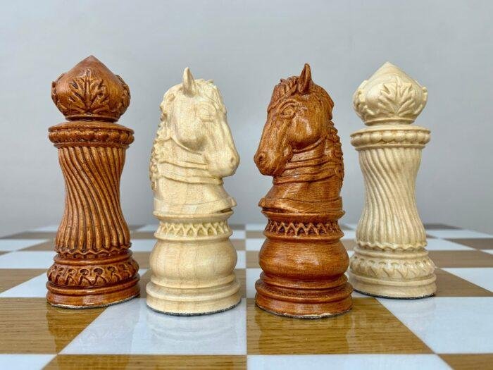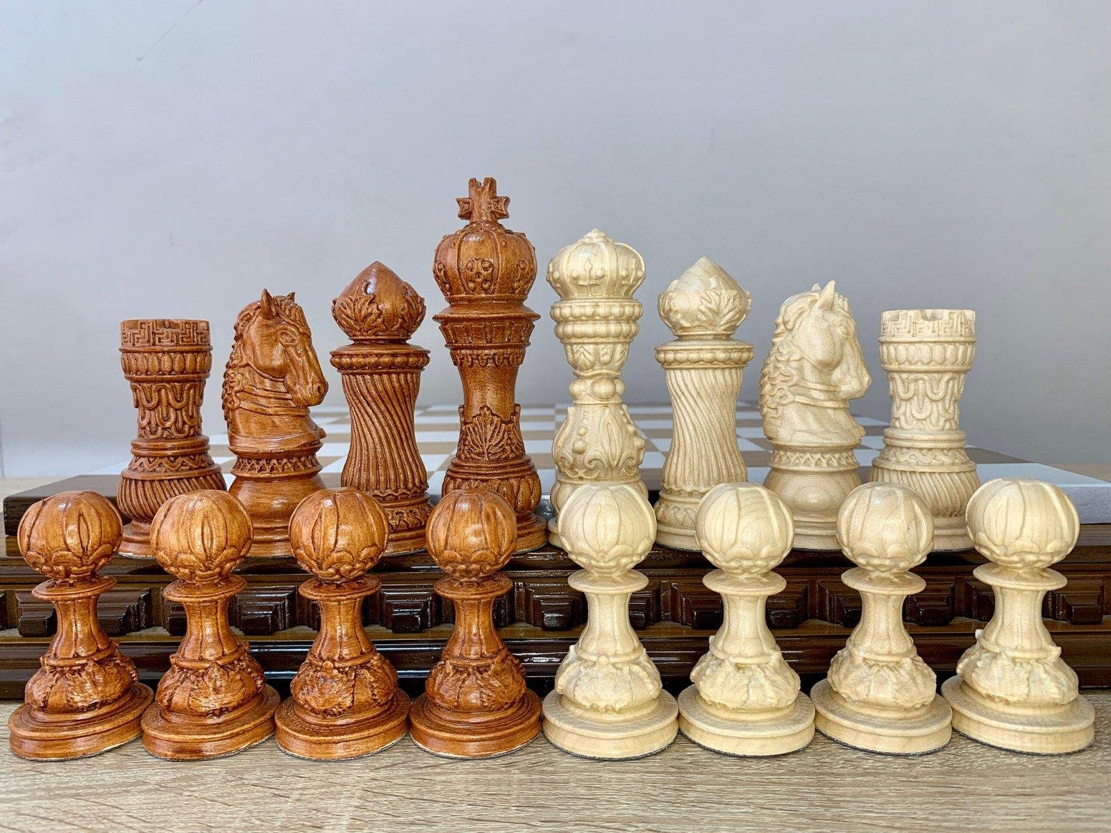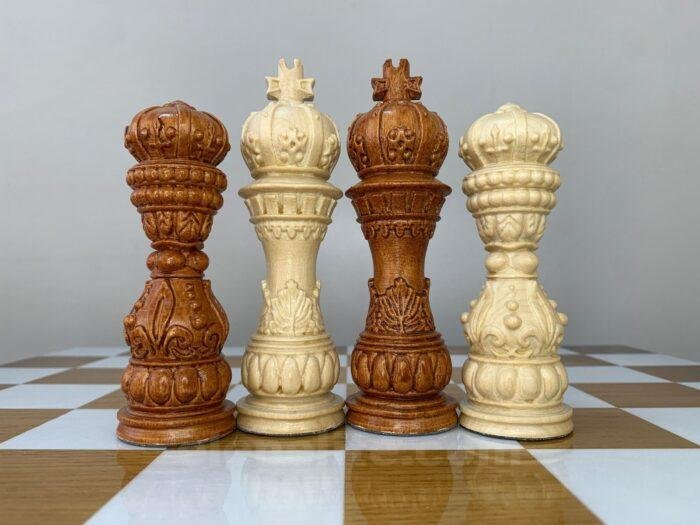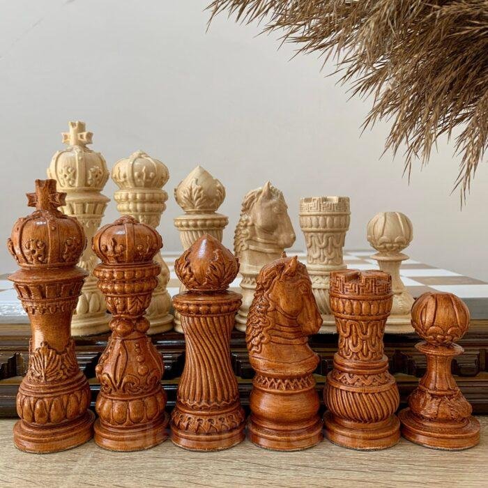 The Elegant Classic chess set is a combination of traditional style and premium performance. 32 pieces are hand-carved from natural maple: 16 are deep black, 16 are in a noble brown ombre. The surface of the pieces is covered with a durable super glossy finish, which emphasizes the rich texture of the wood and gives a noble shine. Detailed hand carving makes each piece unique. This set will be an ideal choice for a gift, a home collection or an everyday game – a classic that is always relevant.