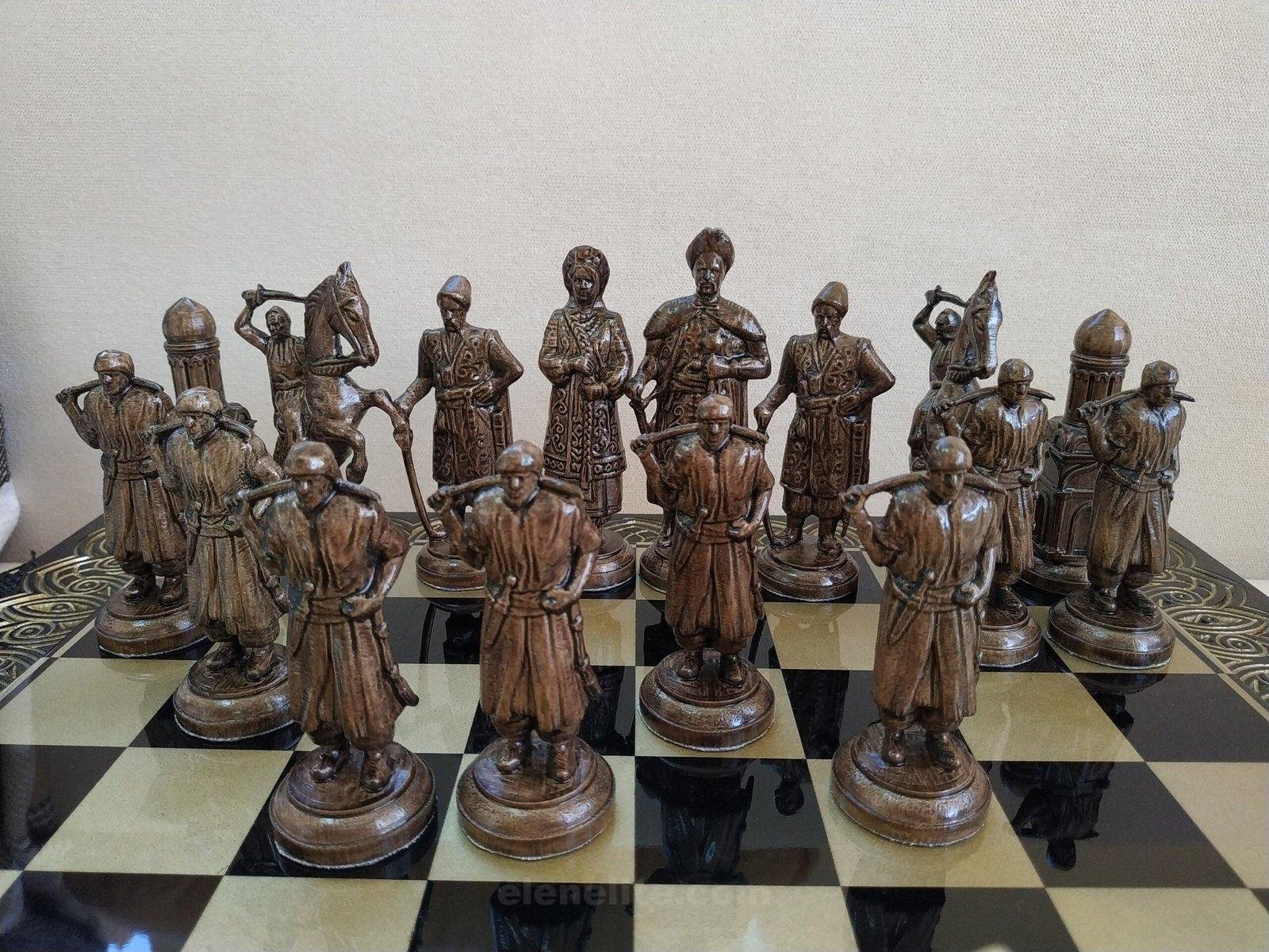 DESIGN: the chess board is decorated with hand carving; 16 pieces – Knights and 16 pieces – Ukrainian Cossacks; exclusively designed by our “Elen Elite” craftsmen.
