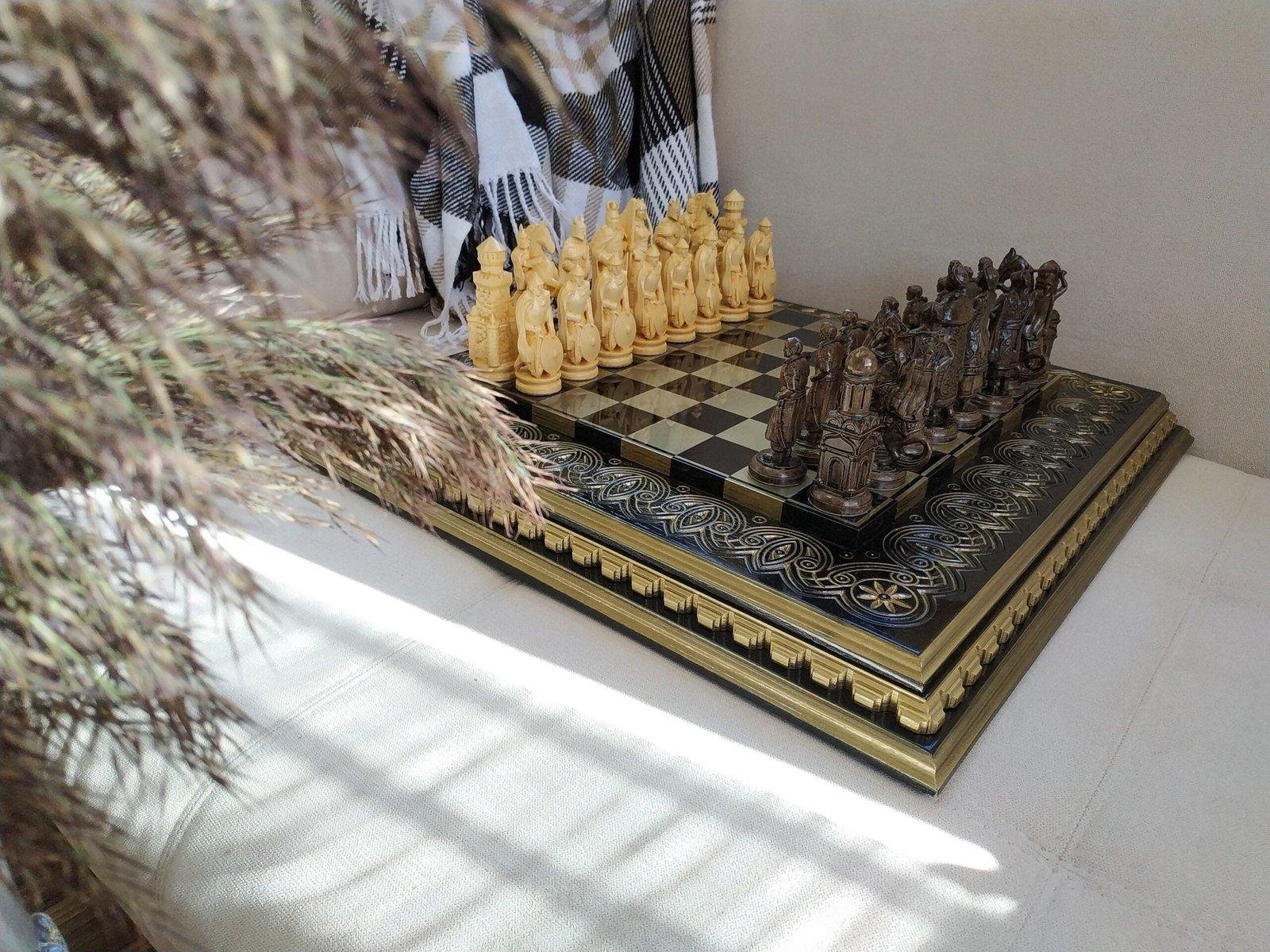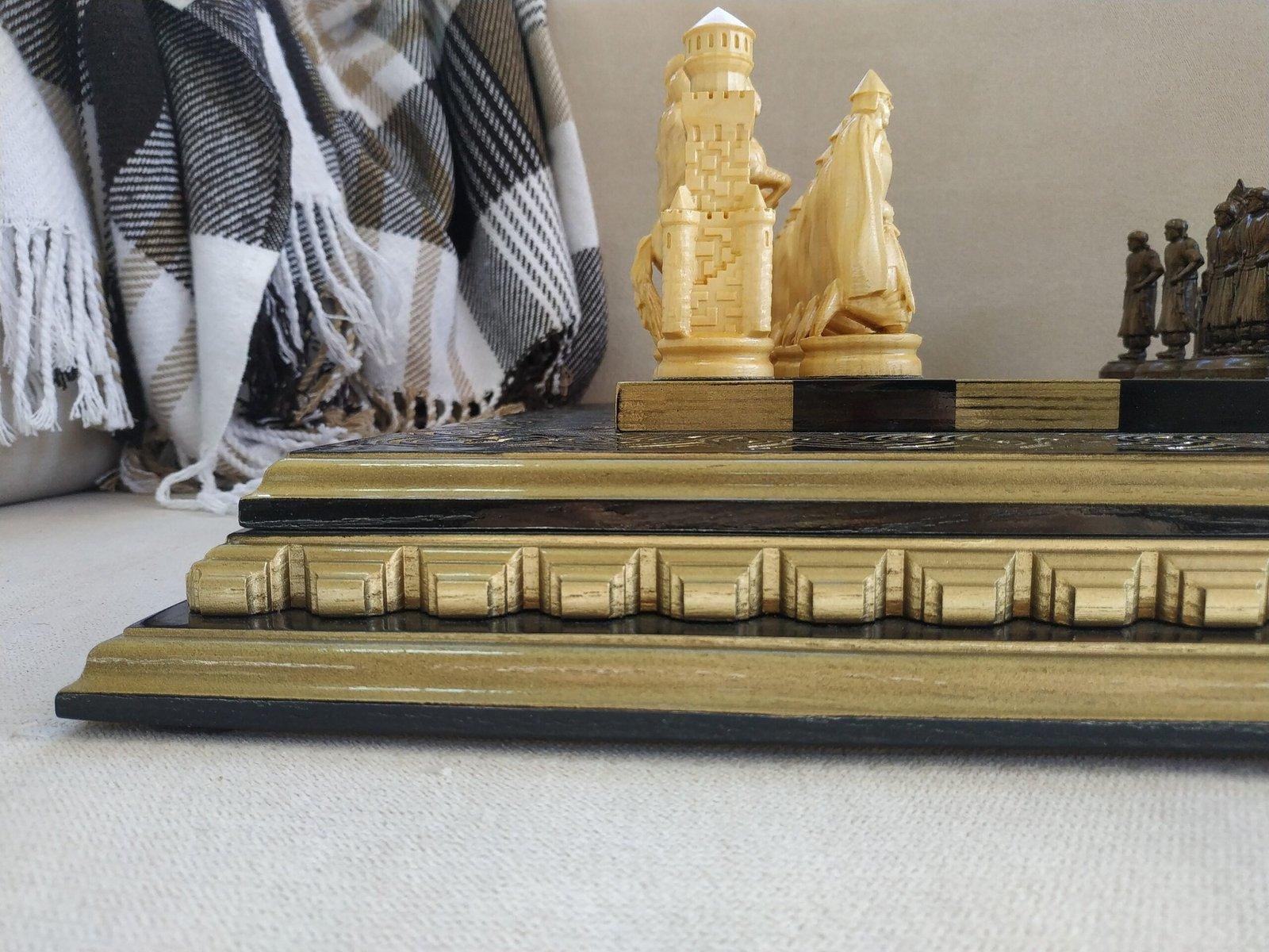 A luxurious handcrafted chess set featuring an ash board in black and gold with expressive carvings and a super glossy finish. The pieces are 16 Ukrainian Cossacks and 16 knights with premium detailing.