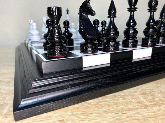 A chess set in a strict classic style – an ash board in black and white and 32 maple chess pieces painted to match. Each piece has a super-glossy coating, ensuring durability and an impressive appearance. The set is perfect for both playing and as a gift.