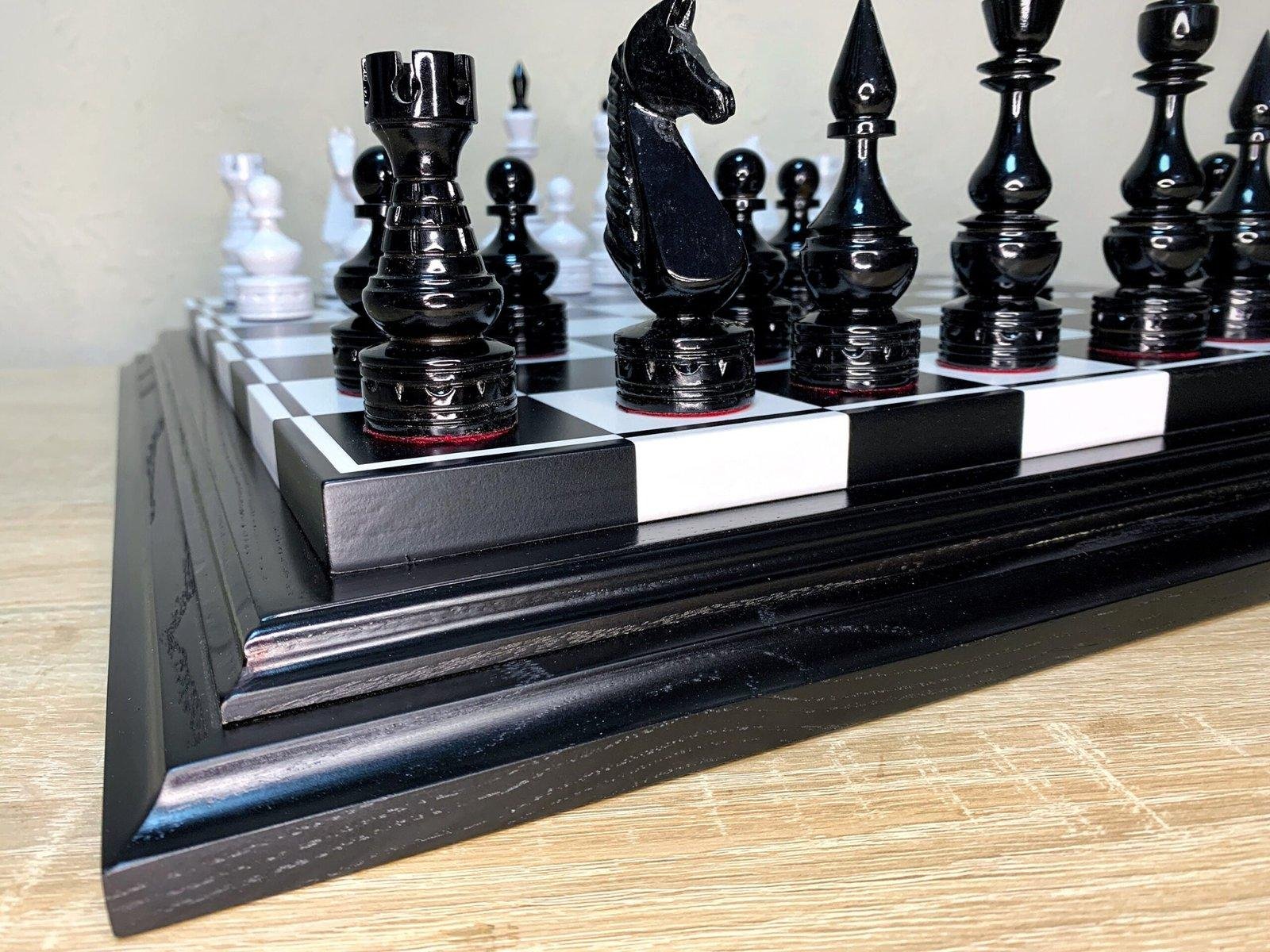 A classic handmade chess set featuring a black and white natural ash board and a set of maple pieces. An ideal choice for those who appreciate traditional style and quality craftsmanship.