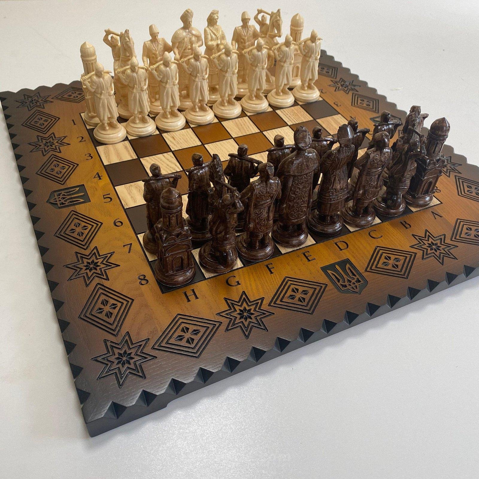 A luxurious handcrafted chess set featuring a beautiful brown ombre ash board, decorated with exquisite carvings inspired by Ukrainian culture. The set includes 32 carefully crafted pieces in the image of Ukrainian Cossacks, giving the game a unique character and historical depth.