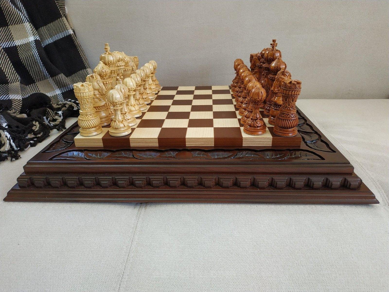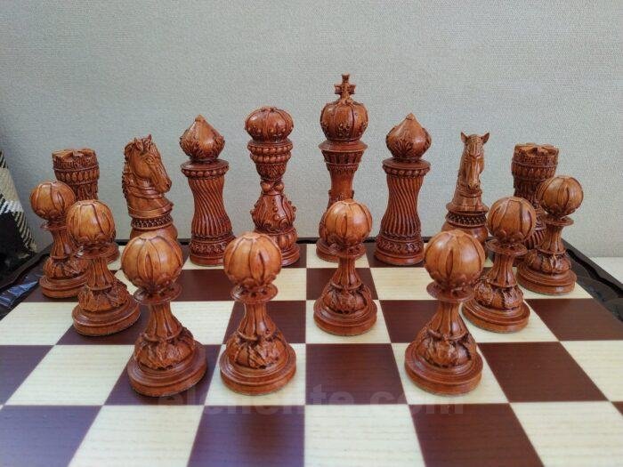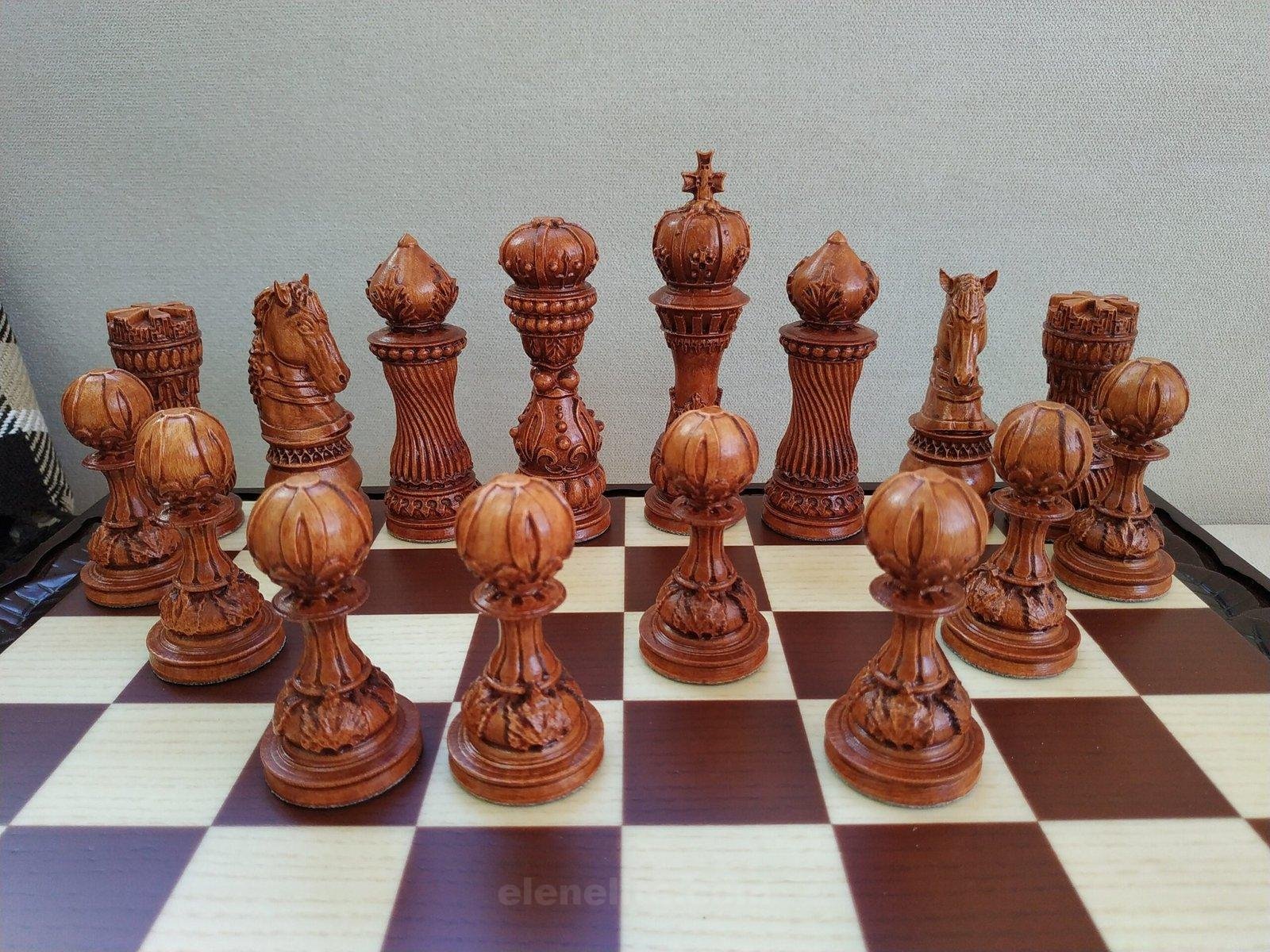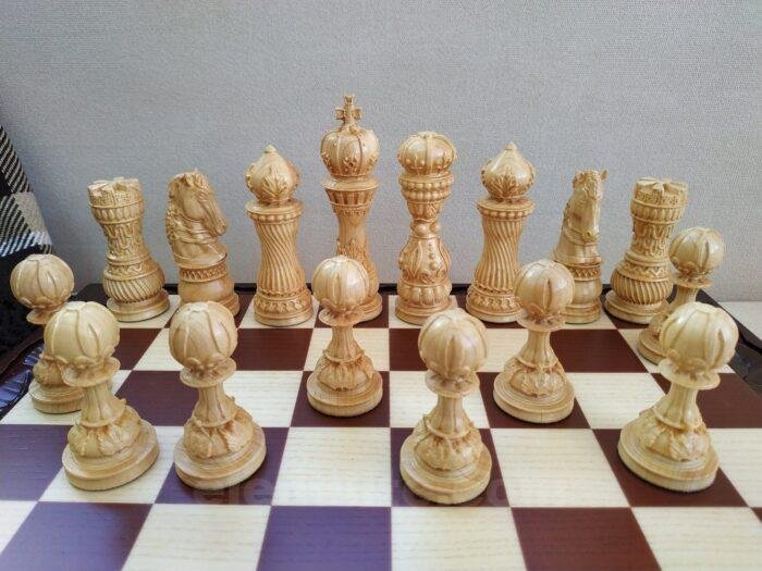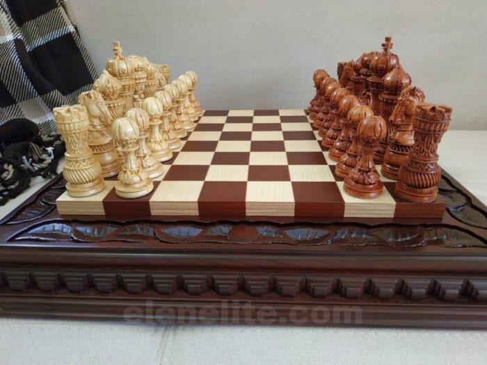 This chess set includes a natural ash board with expressive leaf carvings, painted in a deep brown color. The set includes classic maple chess pieces, made in an elegant style, which perfectly match the board and provide comfortable play. Handcrafted and natural materials make this set an excellent choice for connoisseurs of traditional chess art.
