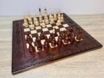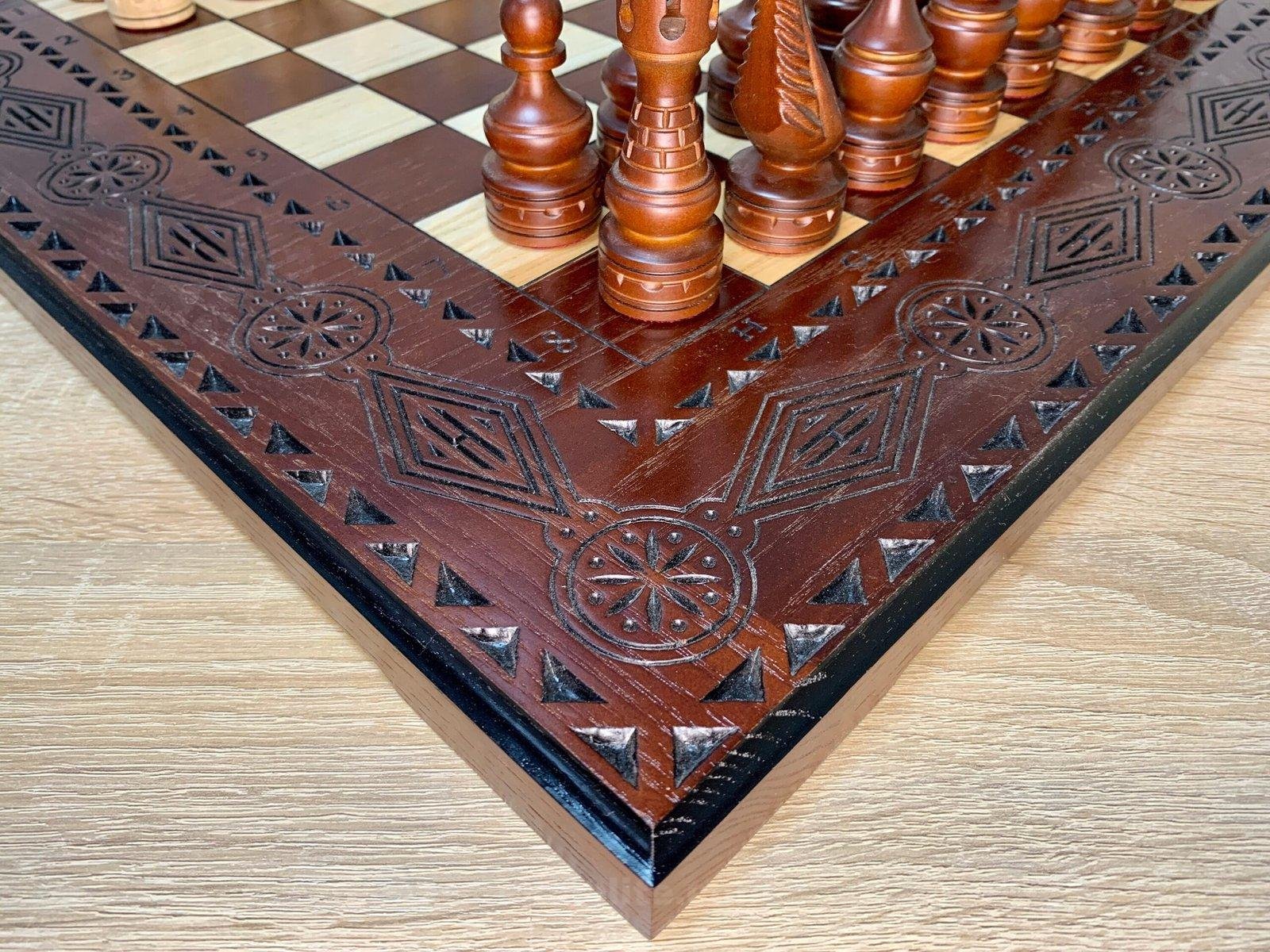 An elegant chess set made from natural wood. The board is made from solid ash, painted in a deep dark brown color, and decorated with carvings that emphasize its noble character. The set is complemented by maple chess pieces in a classic design – strict, elegant and comfortable to play.