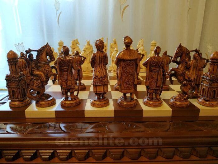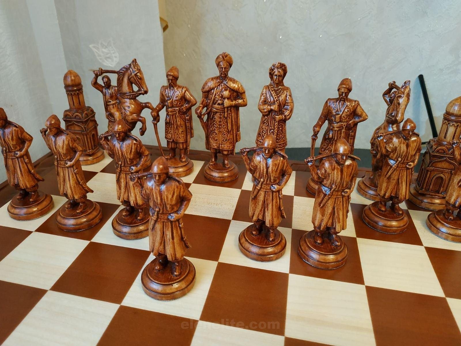Tall Wooden chess pieces “Knights” and “Kozaki” Exclusive handmade + chess board. big, large ,wood chess pieces, unique gift for husband father friend. Carved wood chess pieces rare!