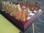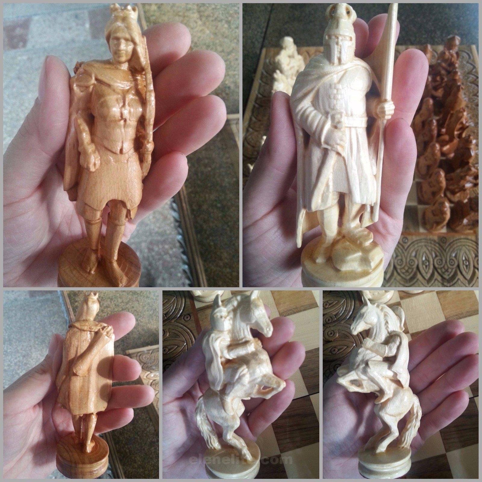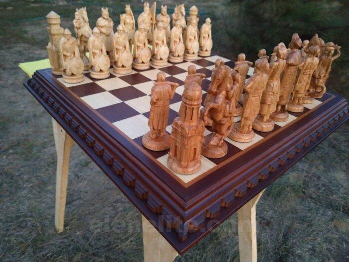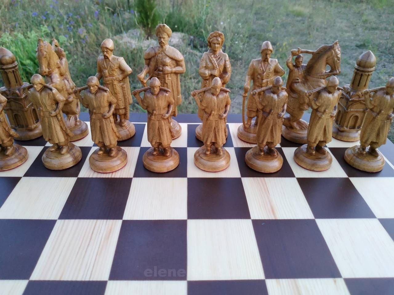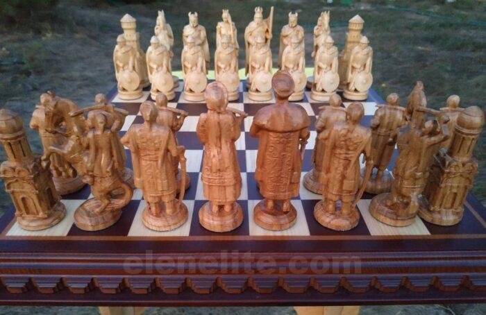 Handmade chess set consists of: classic ash board in dark brown color with carving along the edge. The set includes 32 chess pieces: 16 – Ukrainian Cossacks with the ataman as the king, 16 – in the style of medieval knights. Premium detailing – weapons, shields, clothing elements.