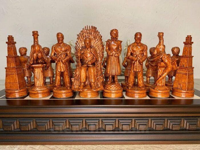 Handcrafted chess set with classic ash board in dark brown. The set includes 16 Knights and 16 reddish brown pieces – characters from the series “Game of Thrones” with premium detailing.