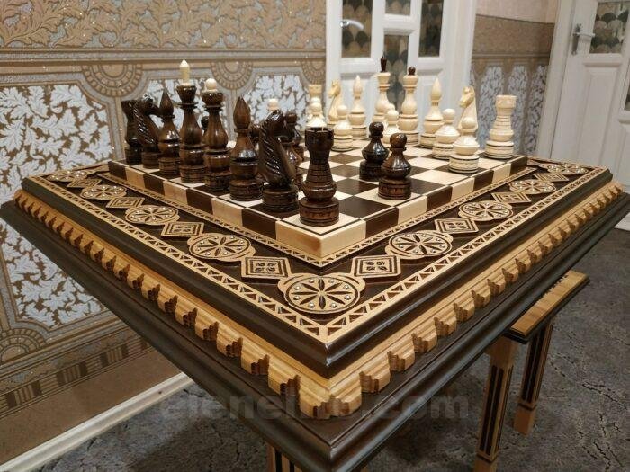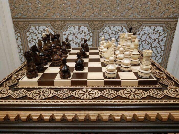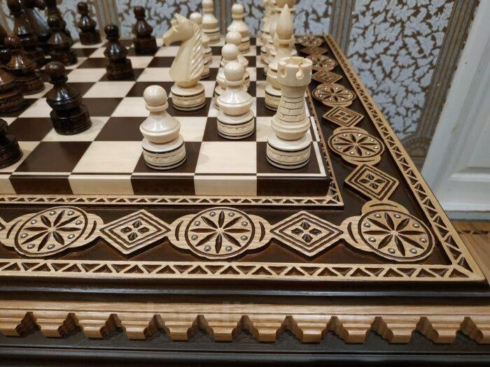 DESIGN: the chess board is decorated with carvings and beads; the chess pieces are made in a classic style; exclusively designed by our “Elen Elite” craftsmen