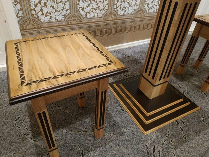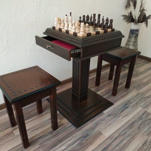 A luxurious ash table with a single leg, carved and beaded details, and two velvet-lined drawers. The set includes two ash stools and a classic maple chess set. The perfect set for play and decor.