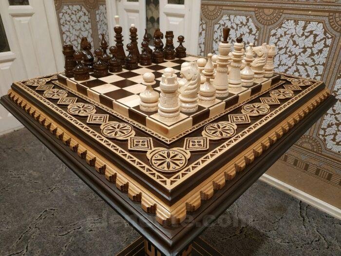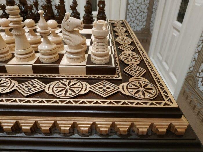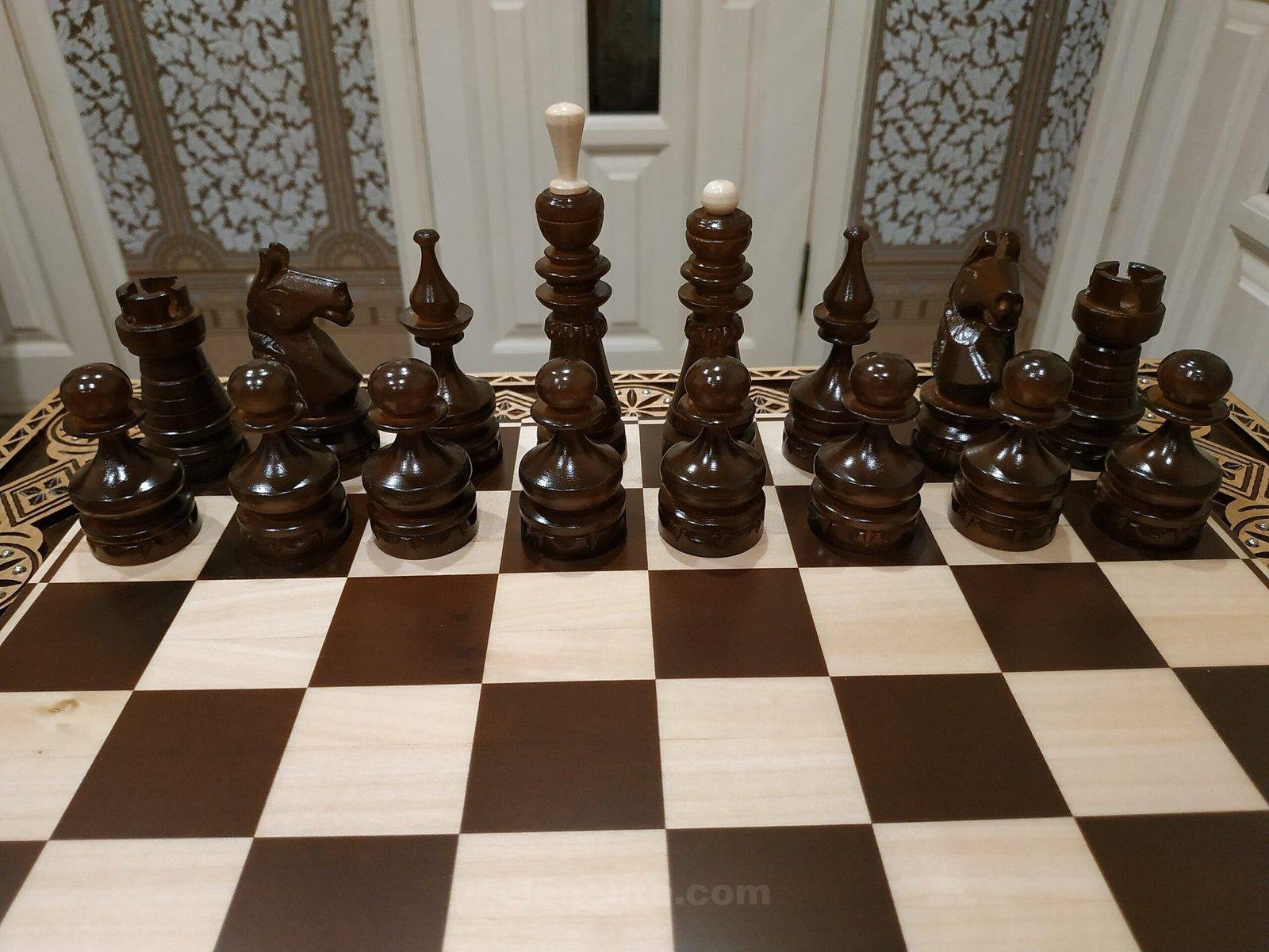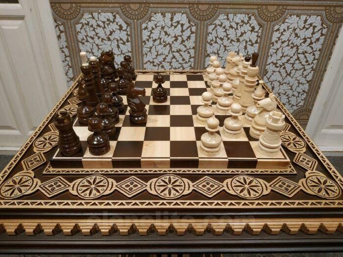 The chess set is handcrafted from natural wood. The game board is made of ash and painted brown. Light carving on the surface and bead inlay emphasize the high level of craftsmanship and give the product a finished look. The pieces are carved from maple and are designed in a classic style. The set is distinguished by its special aesthetics, suitable for both practical play and as a status gift or interior element.